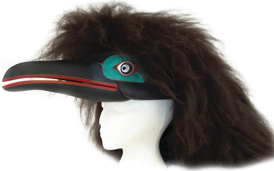 Outstanding hand carved and painted red cedar, long-beaked Haida raven mask whose hinged beak opens (with a pull of the string) to reveal a small spirit carving inside. Excellent condition.,,4-1/2" x 15"