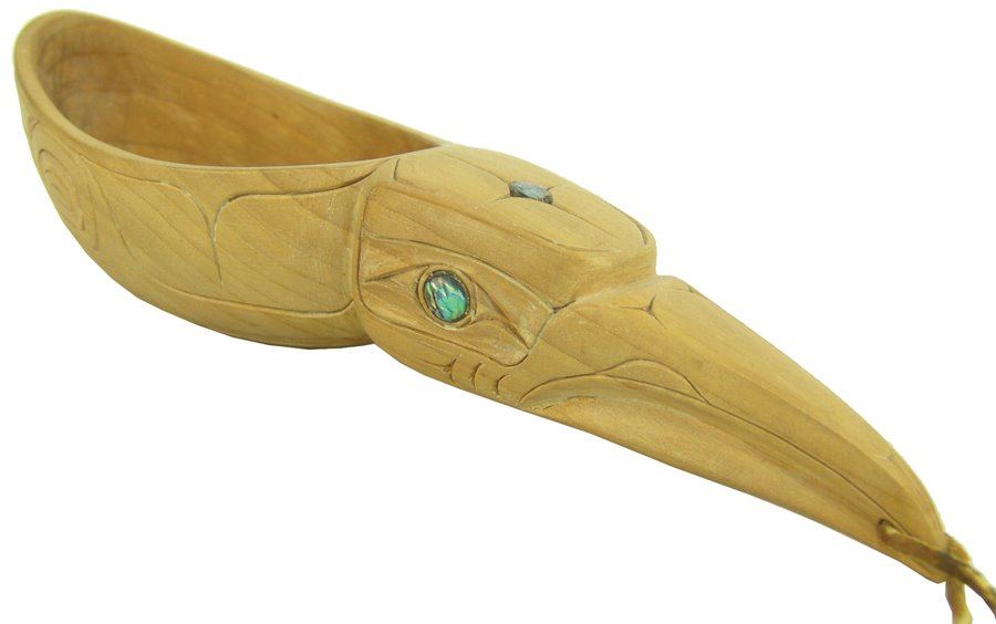 Award winning, expertly carved alder wood ladle done in raven form and with abalone inlays. First prize winner, Gallup Ceremonial, 1979 (with ribbon.) Very good condition.,,10"