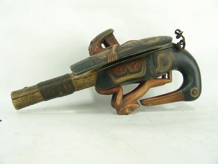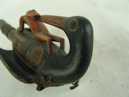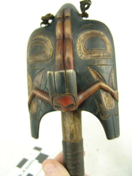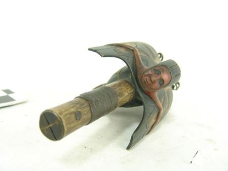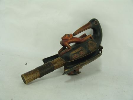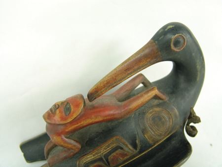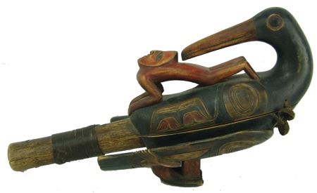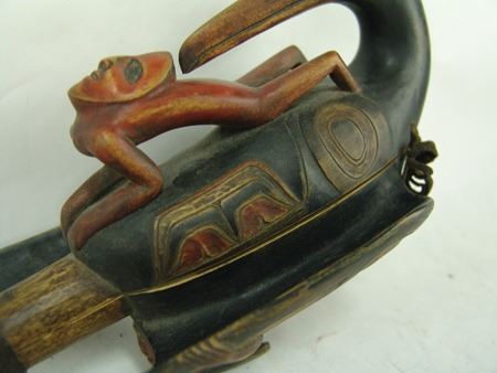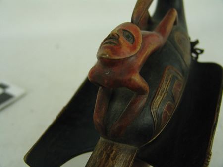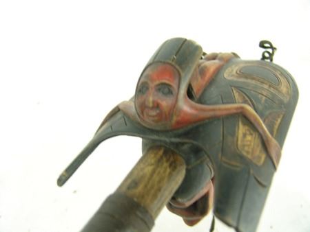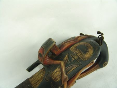 Early/Mid 1900s, Exquisite hand carved and painted alder wood bird rattle showing the bird looking back at a perched human figure on top, and elaborately carved wings on back with another figure with its head pointing up. Very good condition, great patina. Really fine museum quality example. 10"