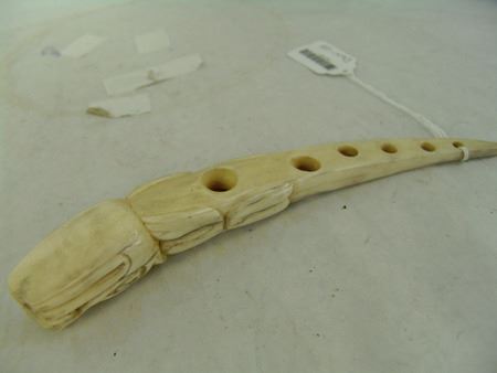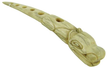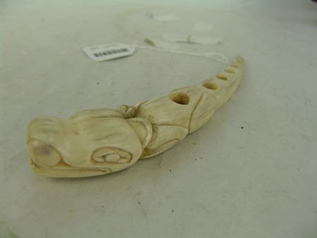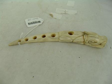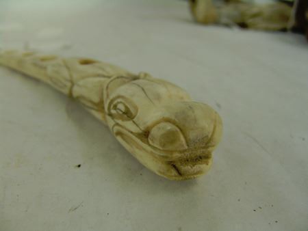 Ca. 1960s-1970s, Beautiful hand carved solid bone netter's awl used for repairing fishing nets and representing a long-tailed creature. This is the "fancy" version. Very good condition. 8"