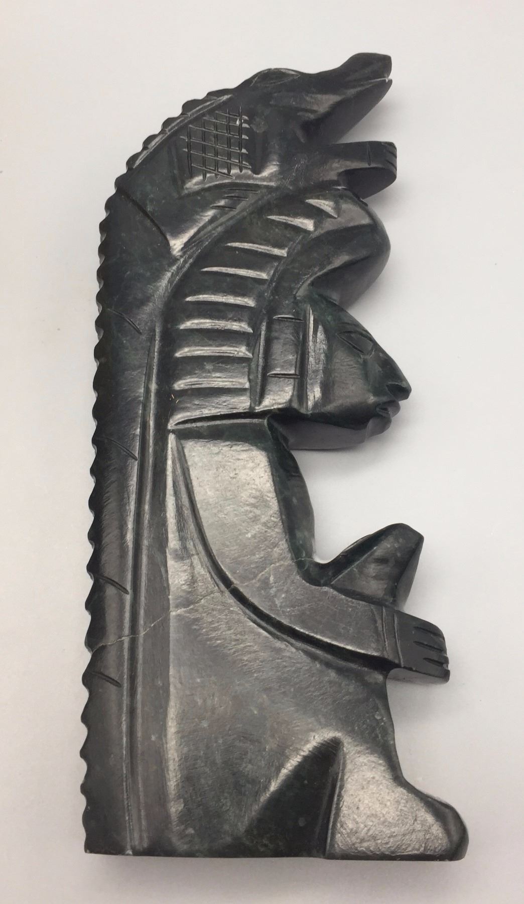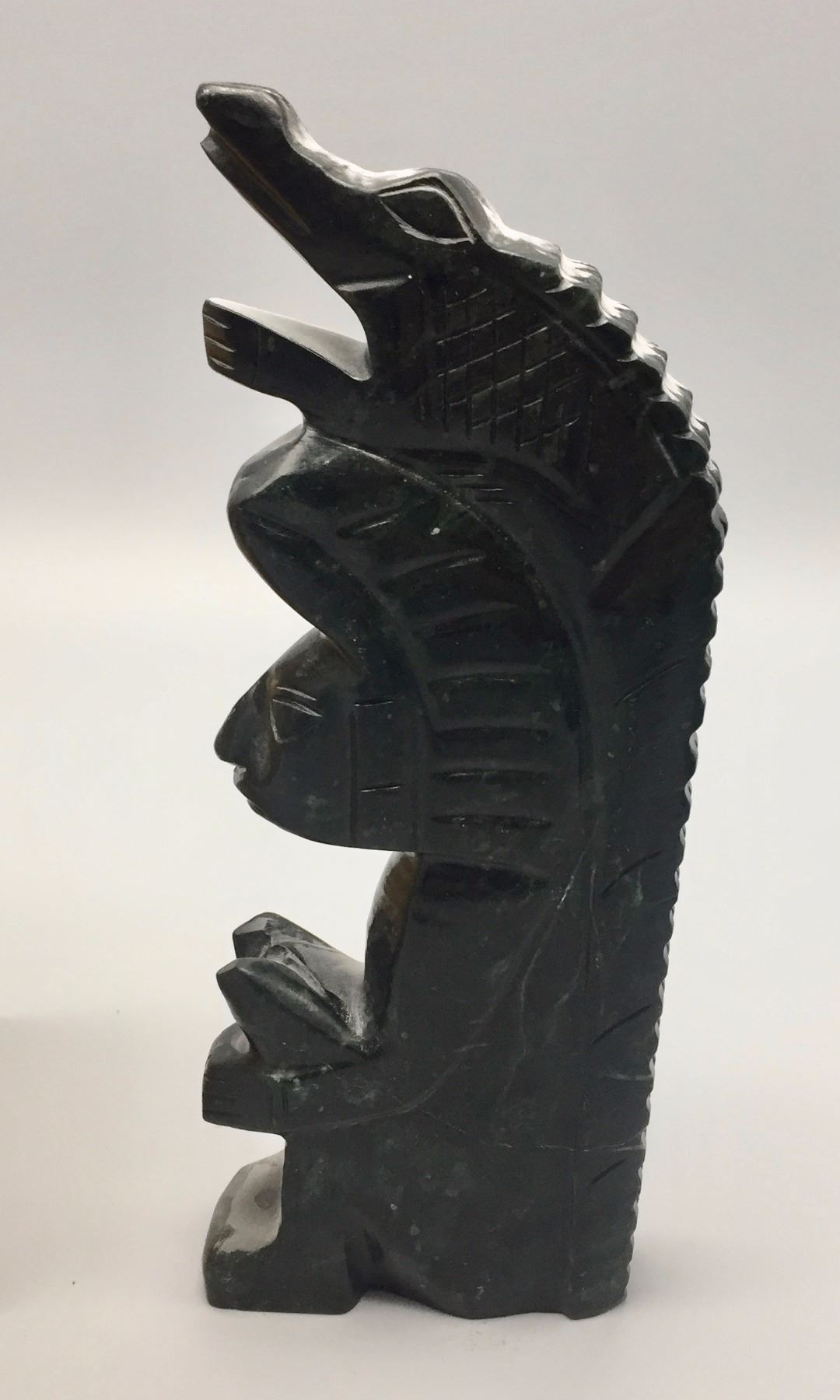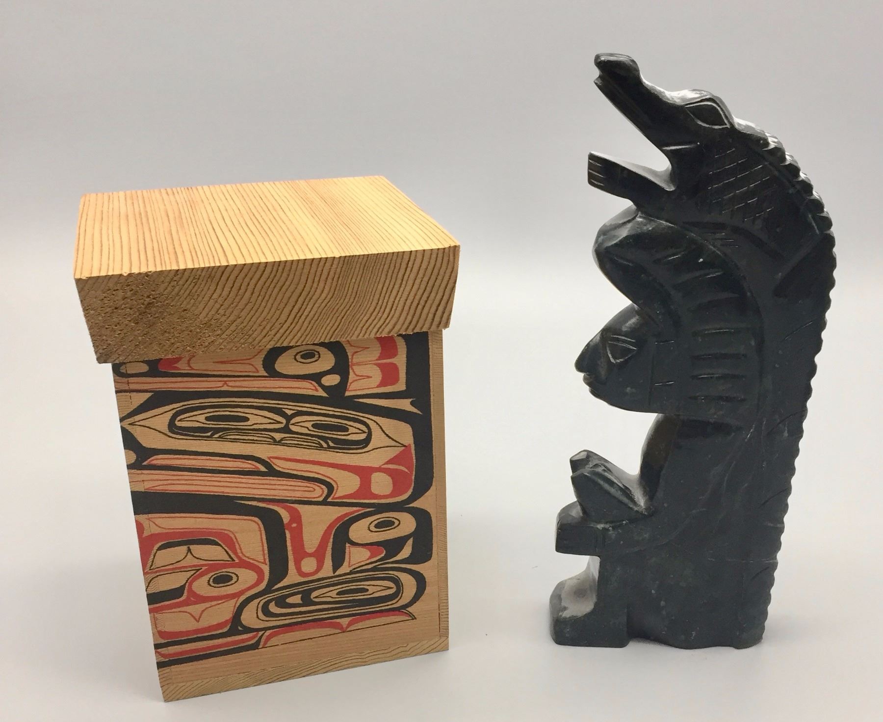 Maker: Box is signed, Les Yates, “Kiajaan” and the stone sculpture is unknown. Approx. Age: Fairly modern. Size: Wood box is about 6.5” tall and the stone sculpture is 8.75” tall. Condition: Good fro their ages, normal wear expected. Additional Info: A handmade and hand-painted box and a nicely hand-carved stone sculpture (and appears to be Serpentine). Please look closely at the pictures - they are an important part of our description. Shipping: There will be a $7 handling / packaging fee for shipping this lot. The actual cost of postage will be added on top of that.