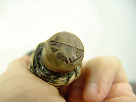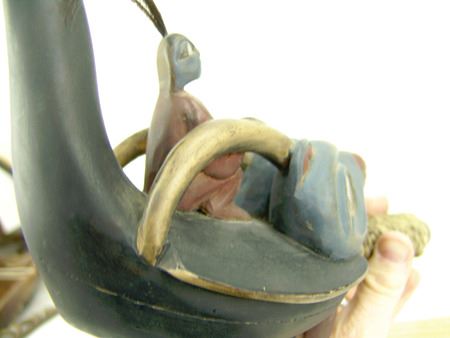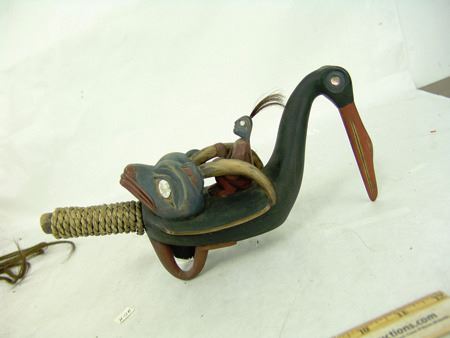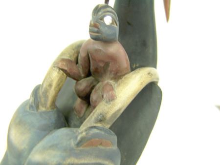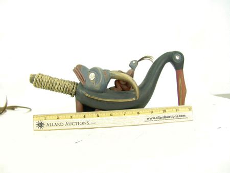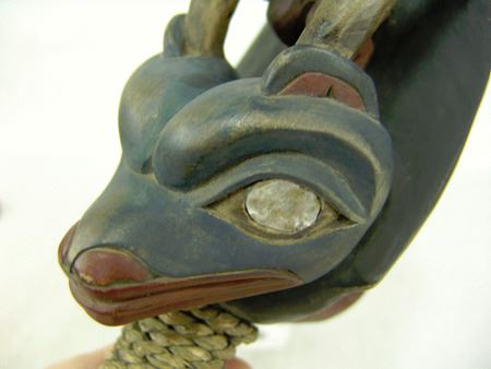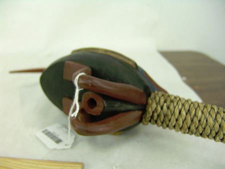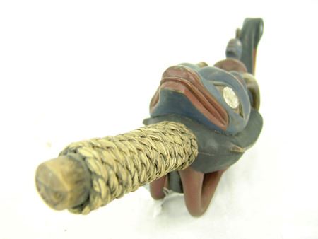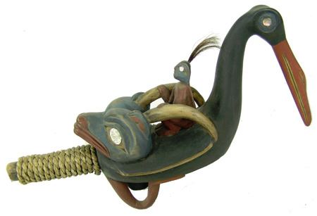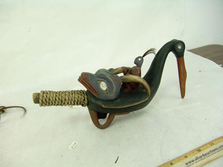 Ca. 1960s, Exquisite hand carved and painted bird rattle with horned zoomorphic head and shaman figures on top, and wrapped braided cornhusk handle. Very good condition. 7" x 13"