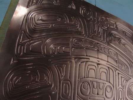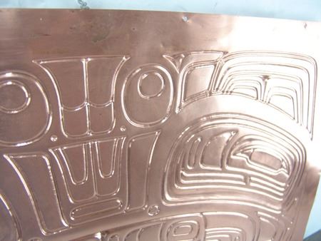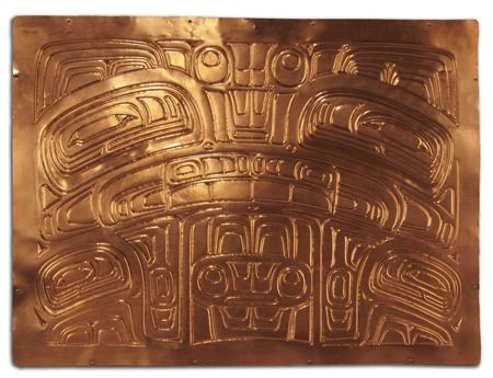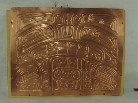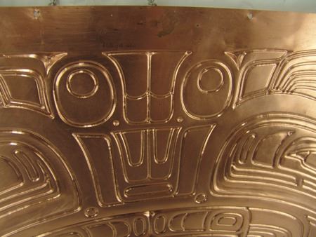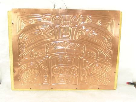 Ca. 2017, Large and impressive hand wrought copper transformation panel paddle, titled "Song of the North." Excellent condition, with holes drilled for mounting. 20" x 26"