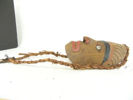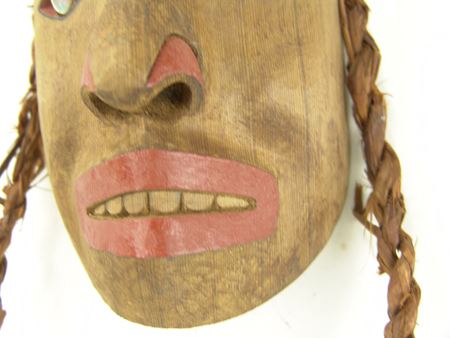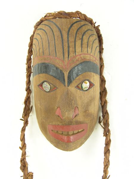 MId/Late 1900s, Traditionally carved and painted cedar wood mask with cedar bark hair, from Alert Bay. Very good, used condition. 10-1/4" x 6-1/2" x 4-1/4" + braids