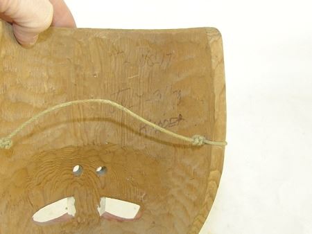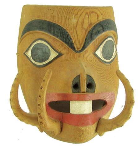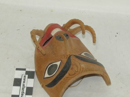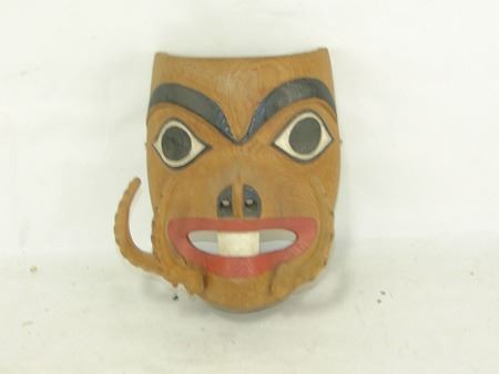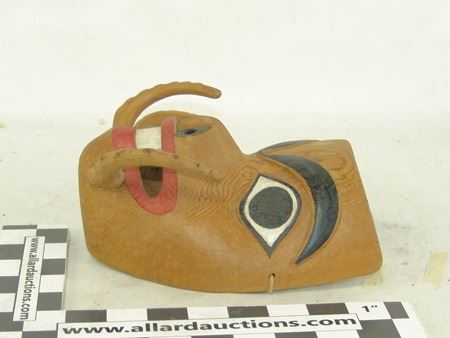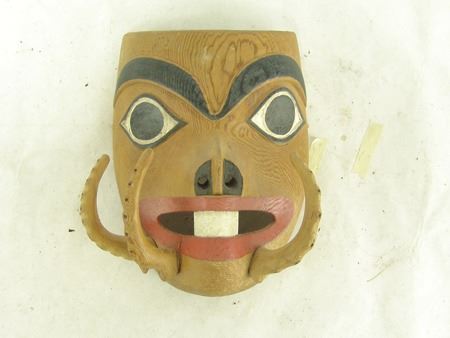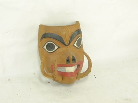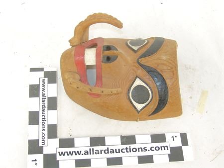 Ca. 1978, Unique hand carved and painted Tlingit mask made out of cedar, done in an unusual design. Very good condition, shows little use. 8"