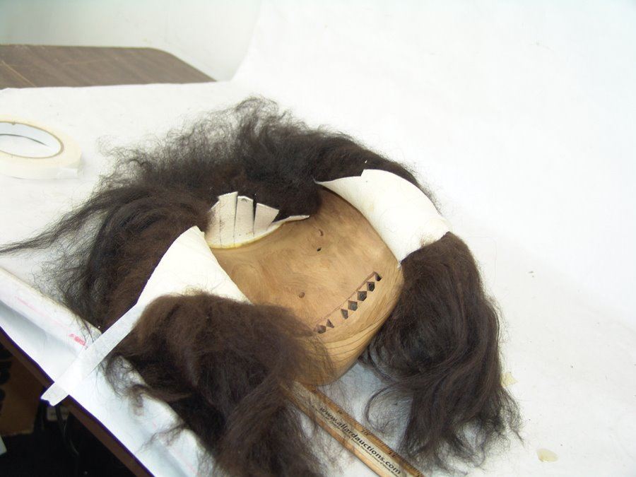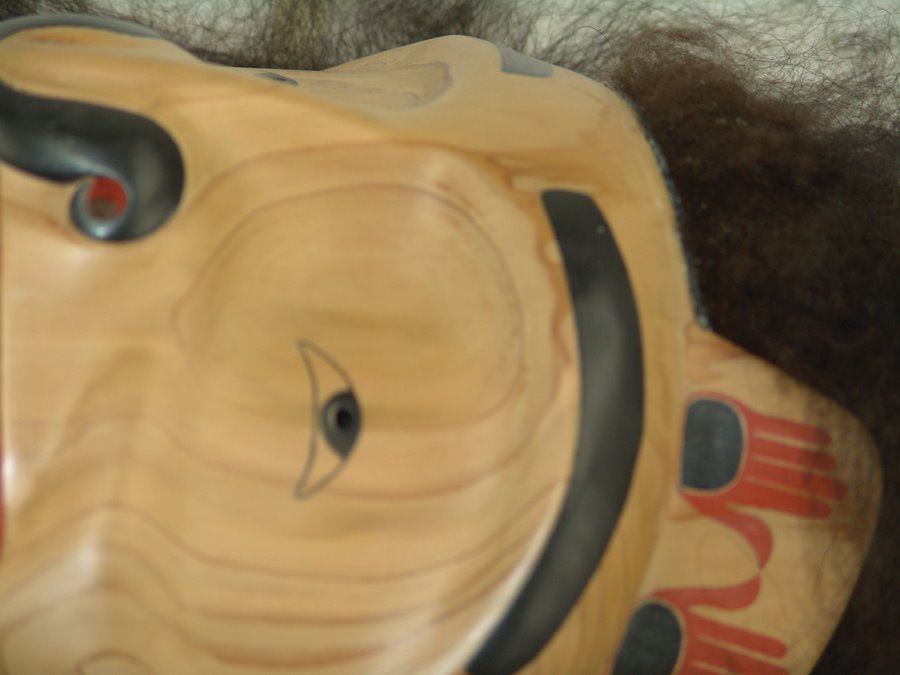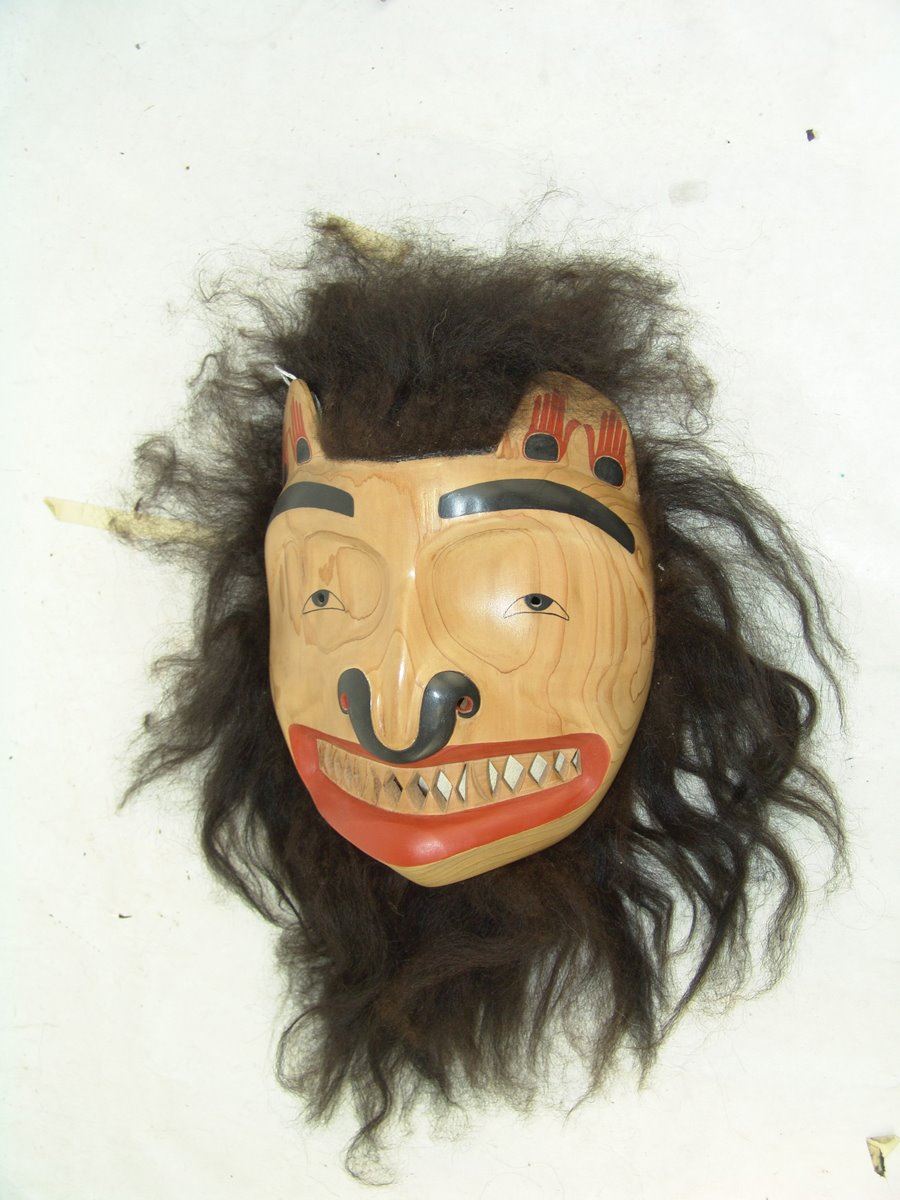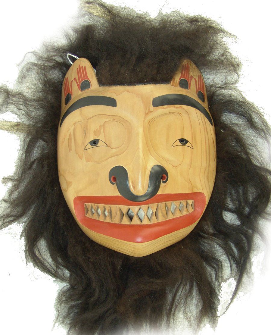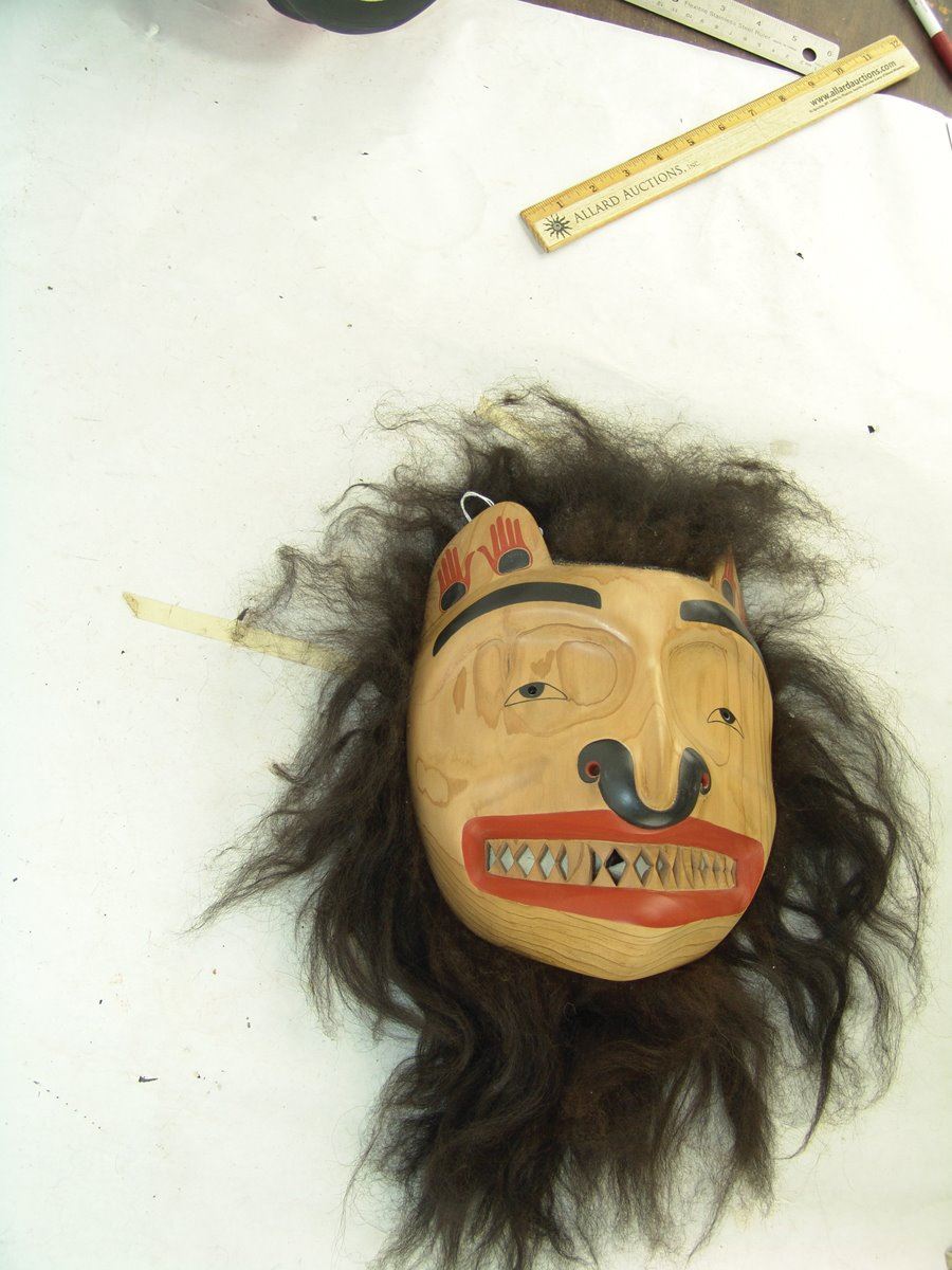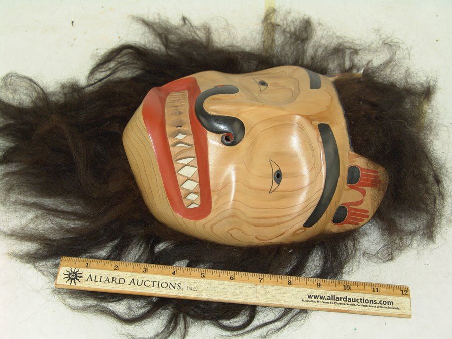 Very fine hand carved and painted Nootka style yellow cedar portrait mask with exposed teeth and lots of hair. Excellent condition.,,9-1/2" x 8"