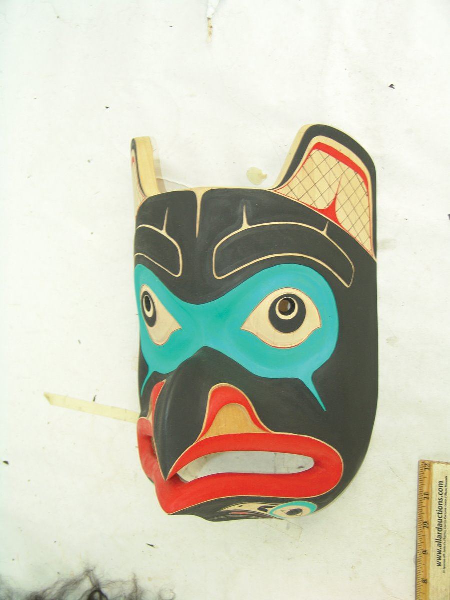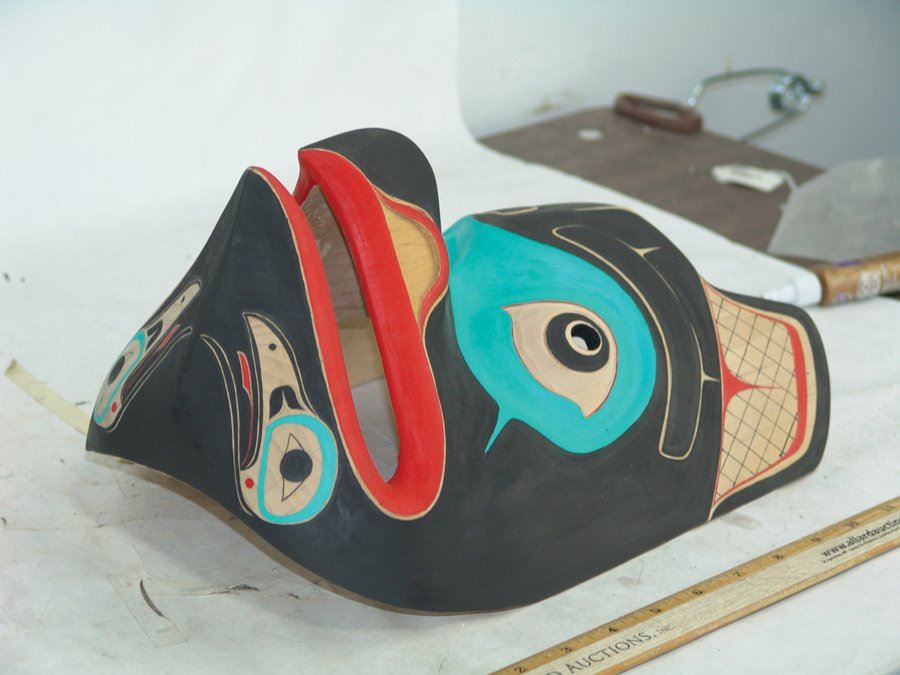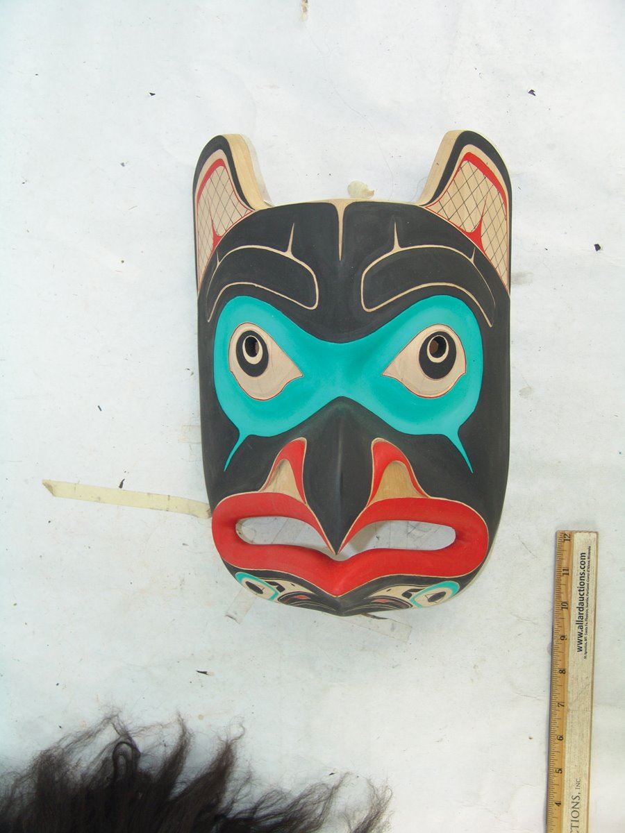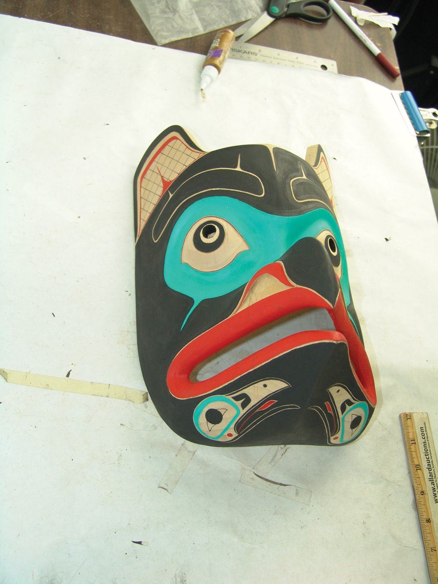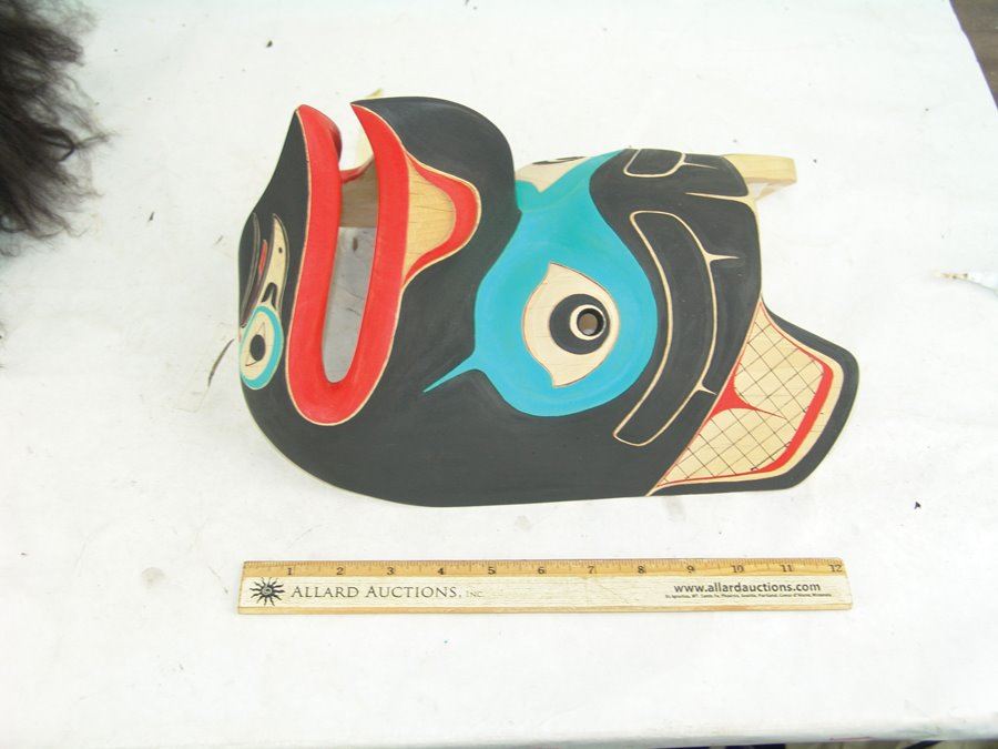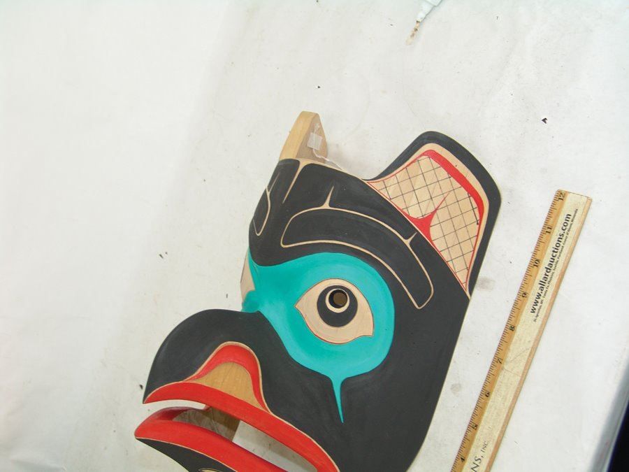 Beautiful hand carved and painted Haida alder wood mask this the blunt nosed raven which is often confused with the eagle. Excellent condition.,,13" x 9"