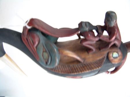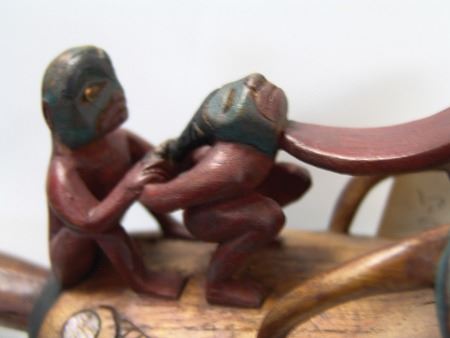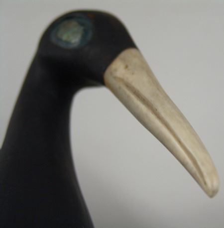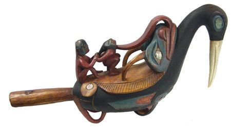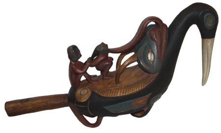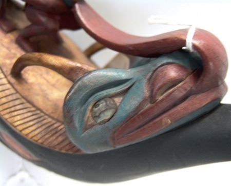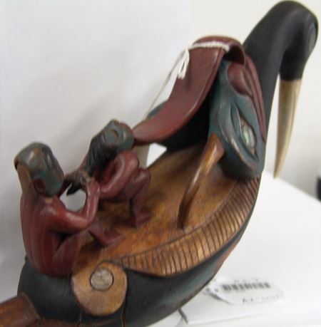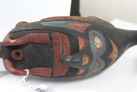 Ca. 1960s-1970s, Exquisite larger hand carved and painted raven rattle with spirit transformation figures on back, facial underbelly, fine details, bone or ivory beak, and inlaid abalone eyes. Very good condition. 18"