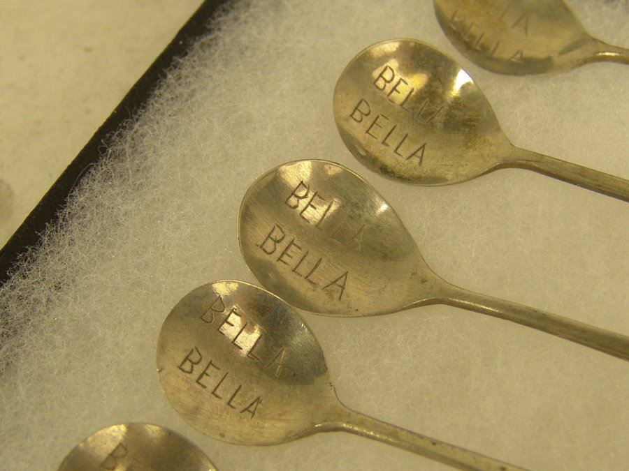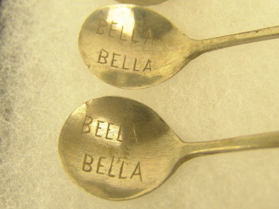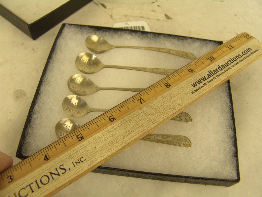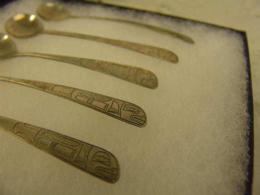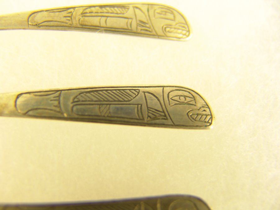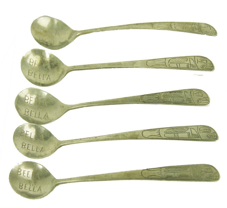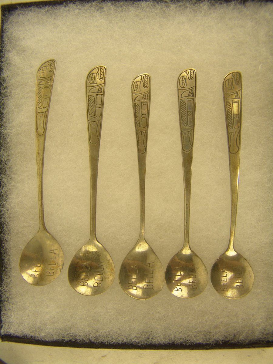 Set of five hand wrought all silver spoons the handles all with carved whale figures on them, the bowls all etched with "Bella Bella." Very good condition.,Mid 1900s,4" each