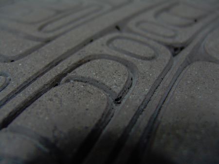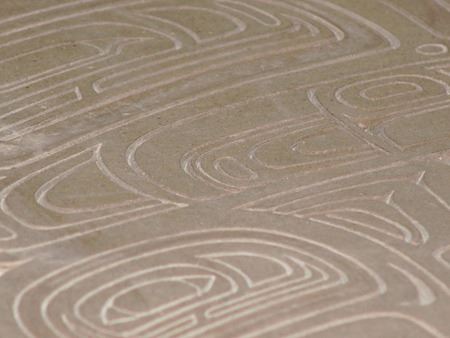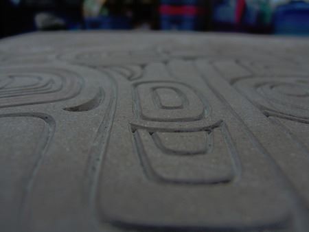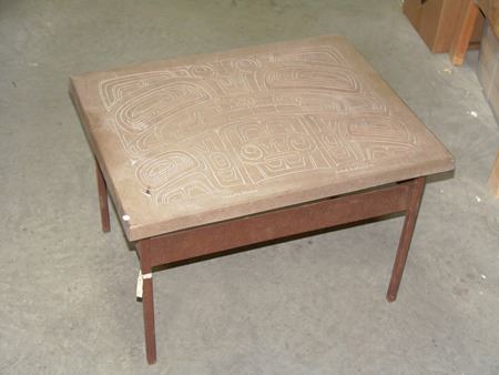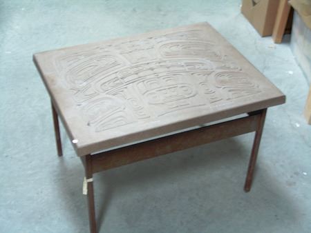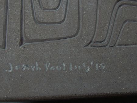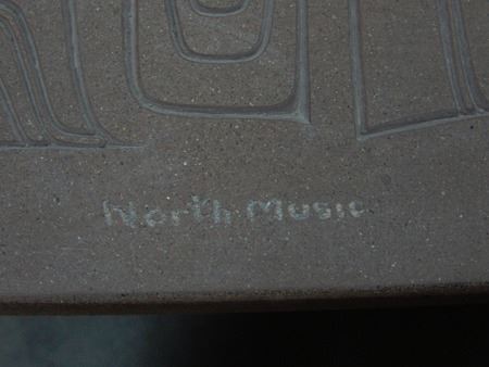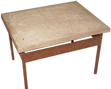 Ca. 2015, A simple welded steel base holding a beautiful 1-1/2" thick cast limited edition stone transformation panel titled "North Music." Very good condition. 19" x 21" x 28"
