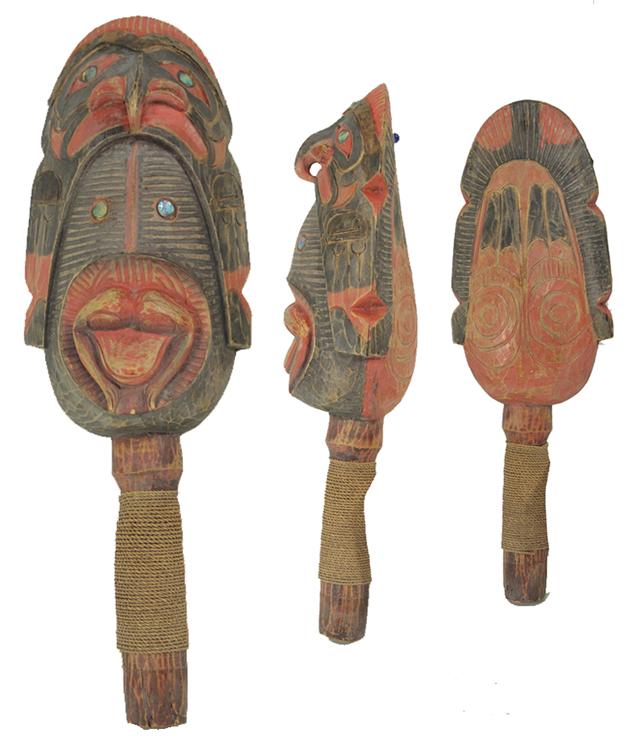 Mid/Late 1900s, Beautiful hand carved and painted rattle with an owl and other creatures and abalone inlays. 16-1/2" x 6" x 4"