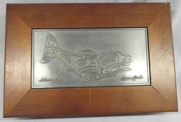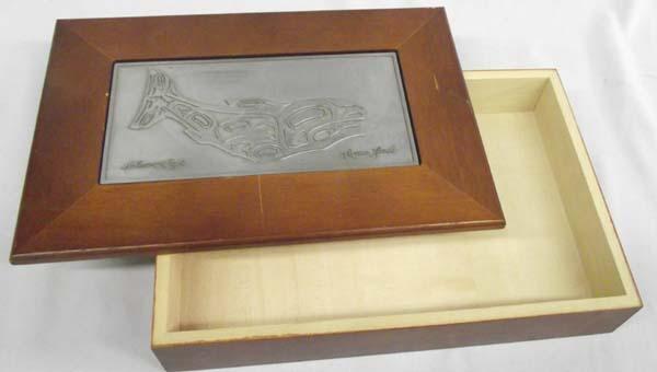 NW Coast Wood and Pewter Box, marked Salmon Eagle Roxana Leask, measures approx. 11.5''L x 7.5''W x 2''H. Buyers Pay Actual Shipping and Handling Charges(see terms and conditions for more information)