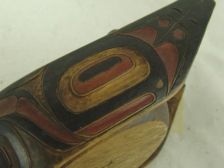 Mid 1900s, Fantastic hand carved and painted wooden grease bowl or feast dish done in bird form with multiple figures on top bottom and sides. Very good condition, wonderful patina. 11-1/2"