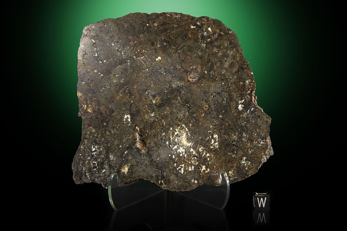 Superb Northwest Africa (NWA) 10514 eucrite meteorite slice found in Morocco in 2015, classified by the by University of Western Ontario as a rare monomict eucrite and part of the HED (howardite/eucrite/diogenite) subgroup. It is also classified as an achondrite—a stone meteorite that does not show chondrules. The full polished slice weighs 156.9 grams and measures approximately 134 mm x 135 mm x 3 mm. It shows impact melt material around the clasts. Accompanied by a certificate of authenticity signed by Geoff Notkin of Aerolite Meteorites Inc. and the TV show Meteorite Men, as well as a specimen identification card.