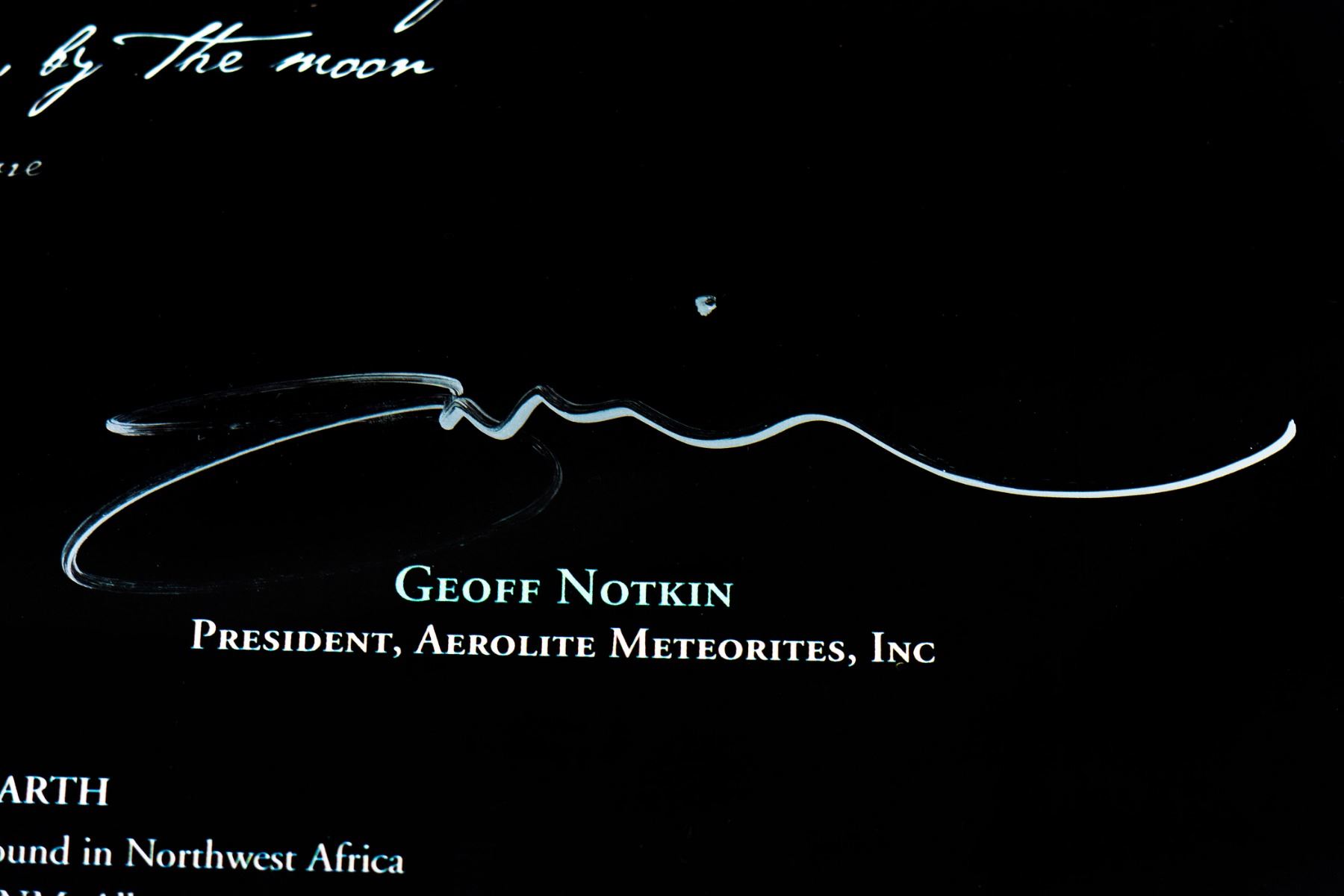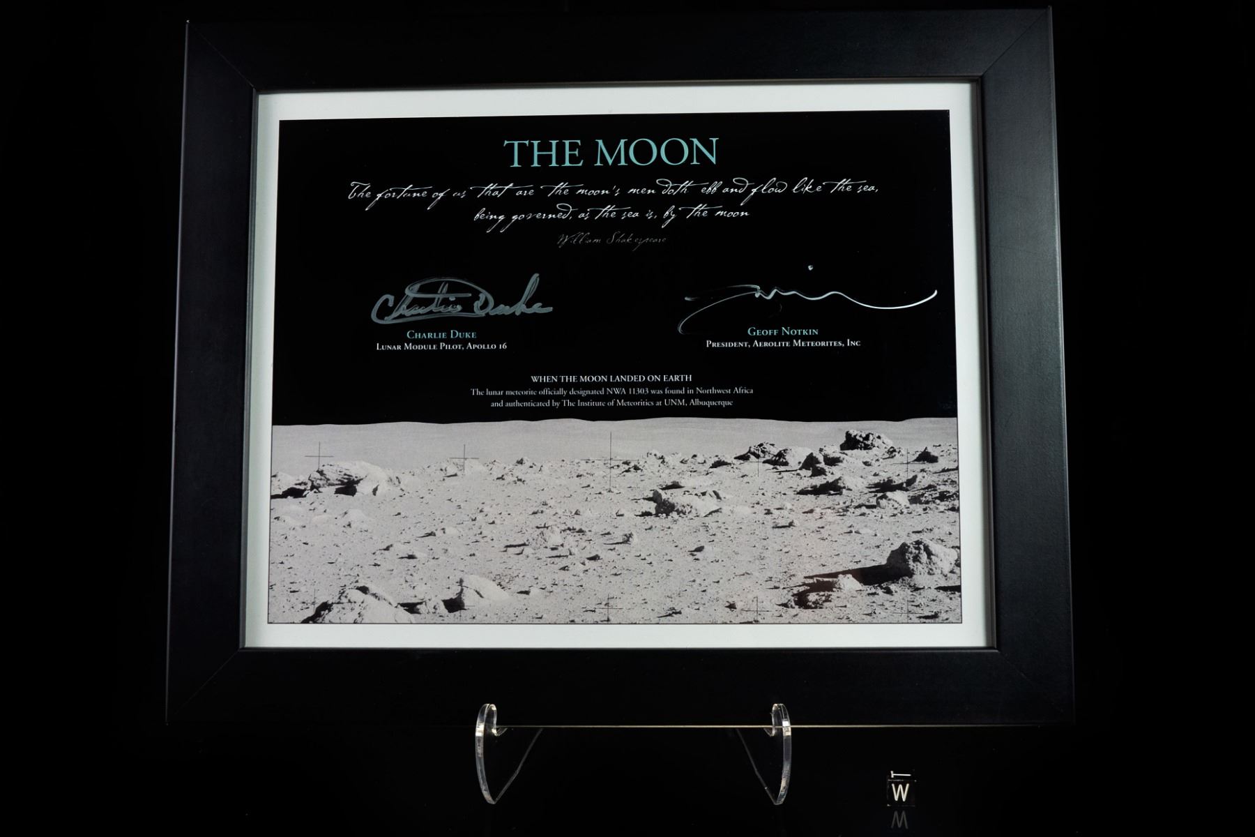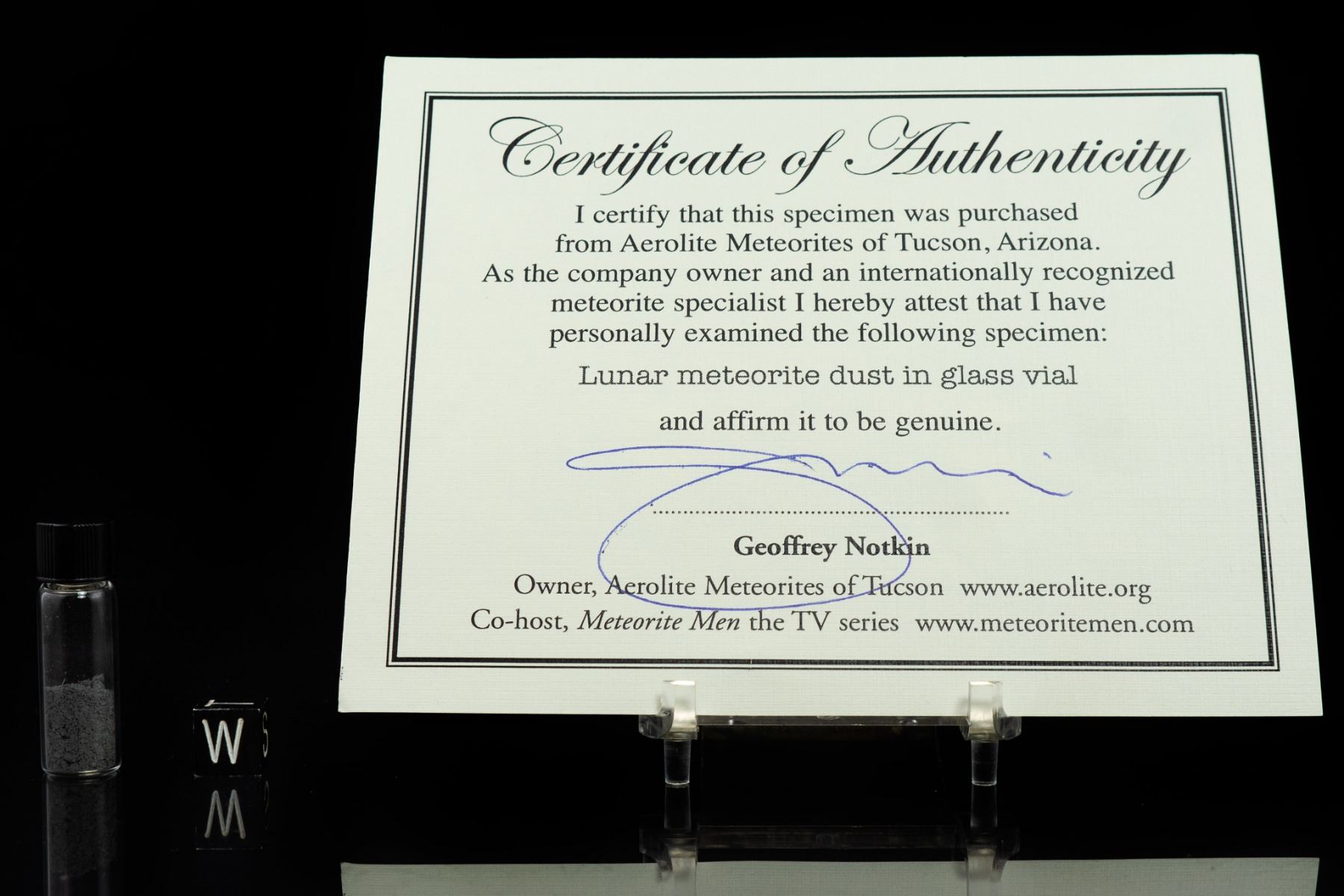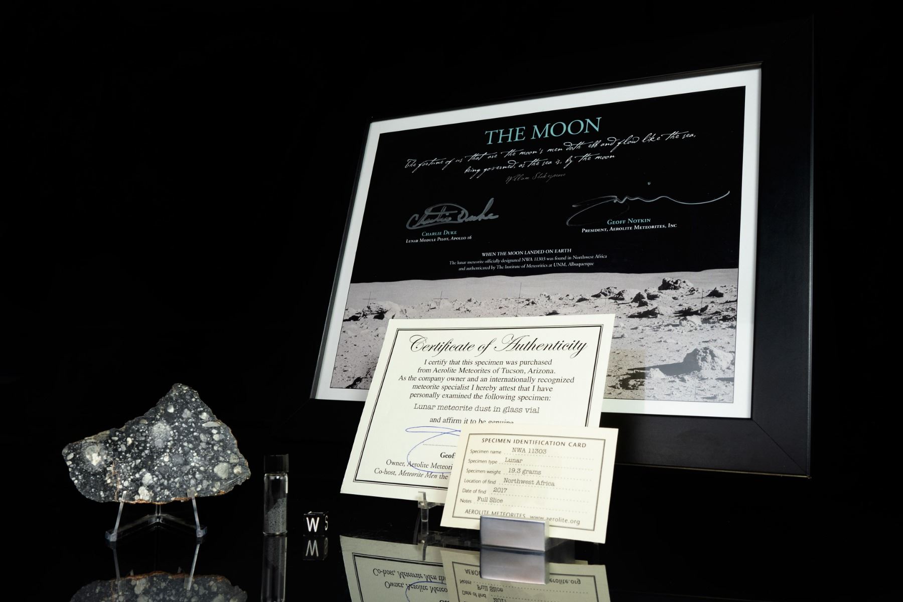 A remarkable lunar meteorite lot, including: a fantastic full slice of the Northwest Africa (NWA) 11303 lunar meteorite, weighing 19.3 grams and measuring approximately 84 mm x 60 mm x 2 mm, comprised of lunar feldspathic regolith breccia, identified by by Drs. Irving and Kuehner at the University of Washington; a small glass vial containing a sample of lunar meteorite dust; and a color 11 x 8.5 certificate of authenticity signed in silver ink by Apollo 16 moonwalker Charlie Duke and Geoff Notkin, the star of TV’s Meteorite Men. Includes two additional certificates of authenticity from Notkin's company, Aerolite Meteorites Inc. Charlie Duke and John Young collected 211 pounds of lunar rock and soil samples during their Apollo 16 EVAs. This is therefore an exceptional set that pairs the autograph of an astronaut who collected moon rocks during his mission with the rare opportunity to own actual pieces of the moon that arrived here as meteorites. An exceptional lot of lunar collectibles.