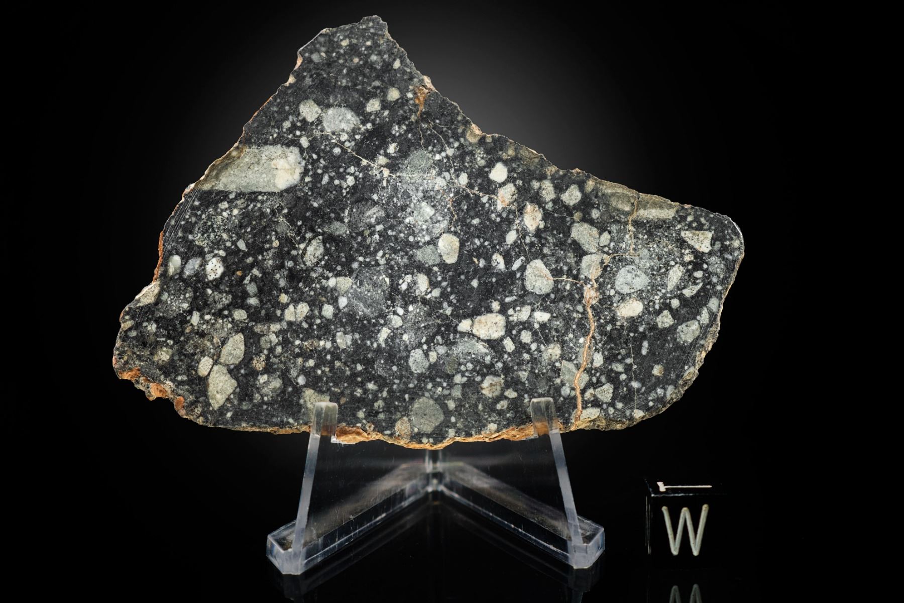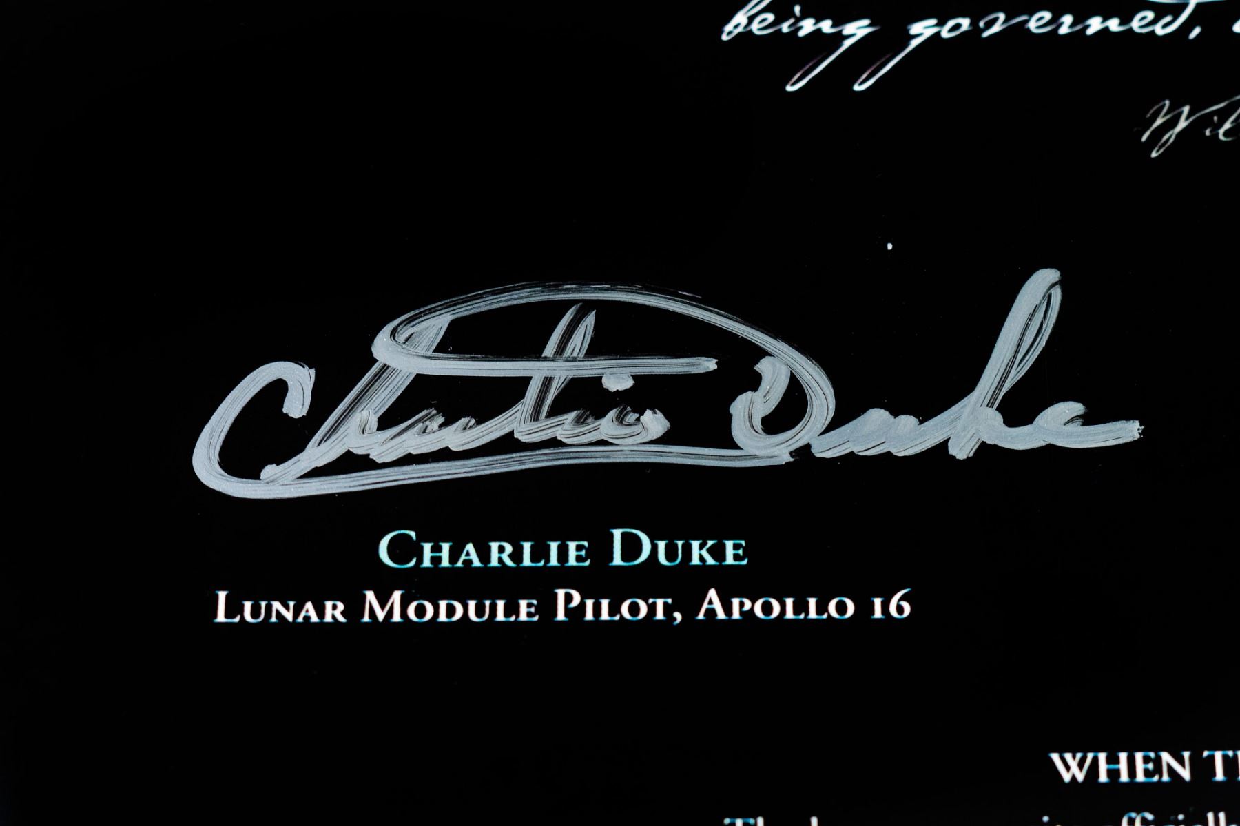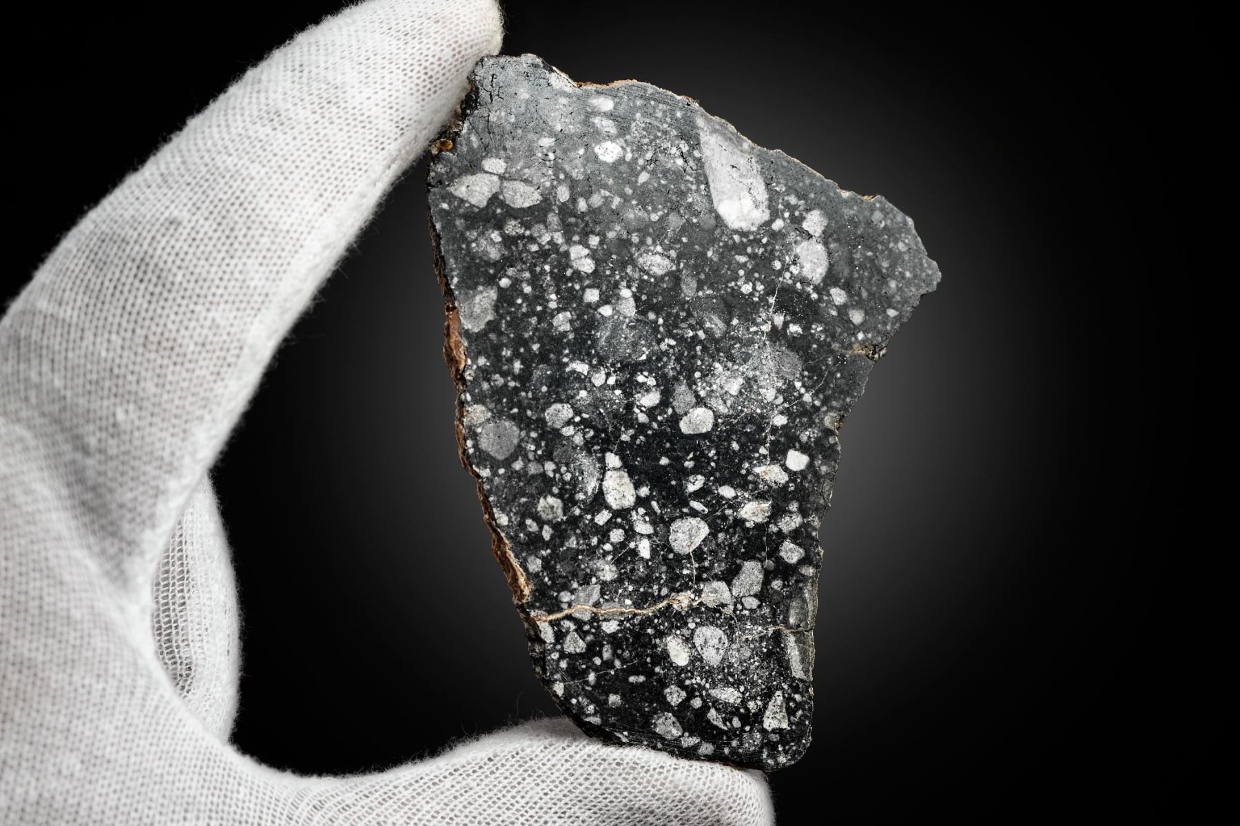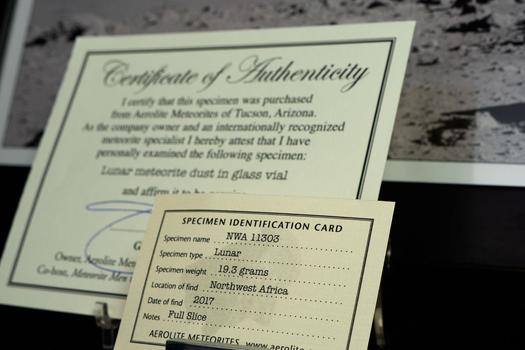 A remarkable lunar meteorite lot, including: a fantastic full slice of the Northwest Africa (NWA) 11303 lunar meteorite, weighing 19.3 grams and measuring approximately 84 mm x 60 mm x 2 mm, comprised of lunar feldspathic regolith breccia, identified by by Drs. Irving and Kuehner at the University of Washington; a small glass vial containing a sample of lunar meteorite dust; and a color 11 x 8.5 certificate of authenticity signed in silver ink by Apollo 16 moonwalker Charlie Duke and Geoff Notkin, the star of TV’s Meteorite Men. Includes two additional certificates of authenticity from Notkin's company, Aerolite Meteorites Inc. Charlie Duke and John Young collected 211 pounds of lunar rock and soil samples during their Apollo 16 EVAs. This is therefore an exceptional set that pairs the autograph of an astronaut who collected moon rocks during his mission with the rare opportunity to own actual pieces of the moon that arrived here as meteorites. An exceptional lot of lunar collectibles.
