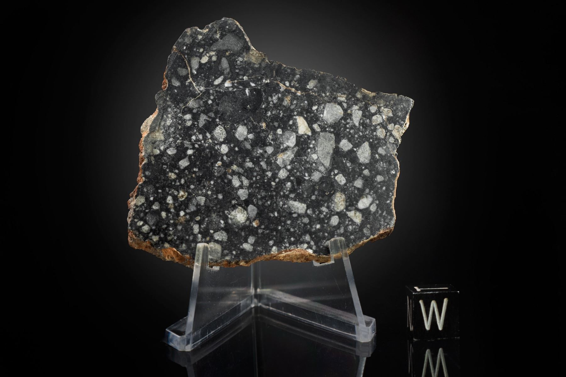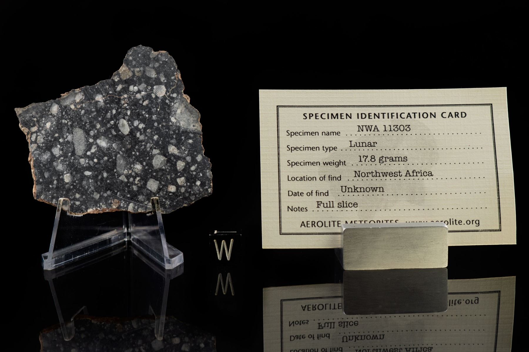 Superb Northwest Africa (NWA) 11303 lunar meteorite slice, comprised of lunar feldspathic breccia. The full slice weighs 17.8 grams and measures approximately 55 mm x 55 mm x 2 mm. This is an actual fragment of the moon, identified as a feldspathic regolith breccia by Drs. Irving and Kuehner at the University of Washington. Among the rarest materials on Earth, this lunar meteorite was expertly prepared in the lab, using a special saw to show off its marvelous fragmented (brecciated) interior. Accompanied by a certificate of authenticity signed by Geoff Notkin of Aerolite Meteorites Inc. and the TV show Meteorite Men, as well as a specimen identification card.