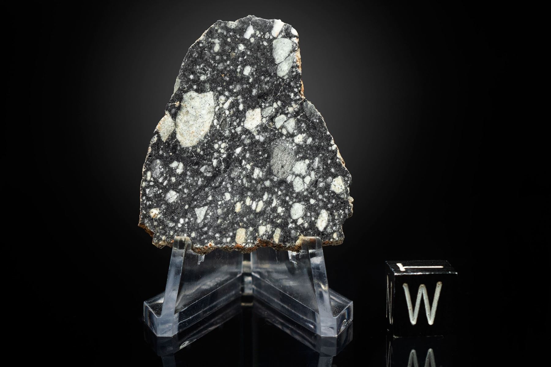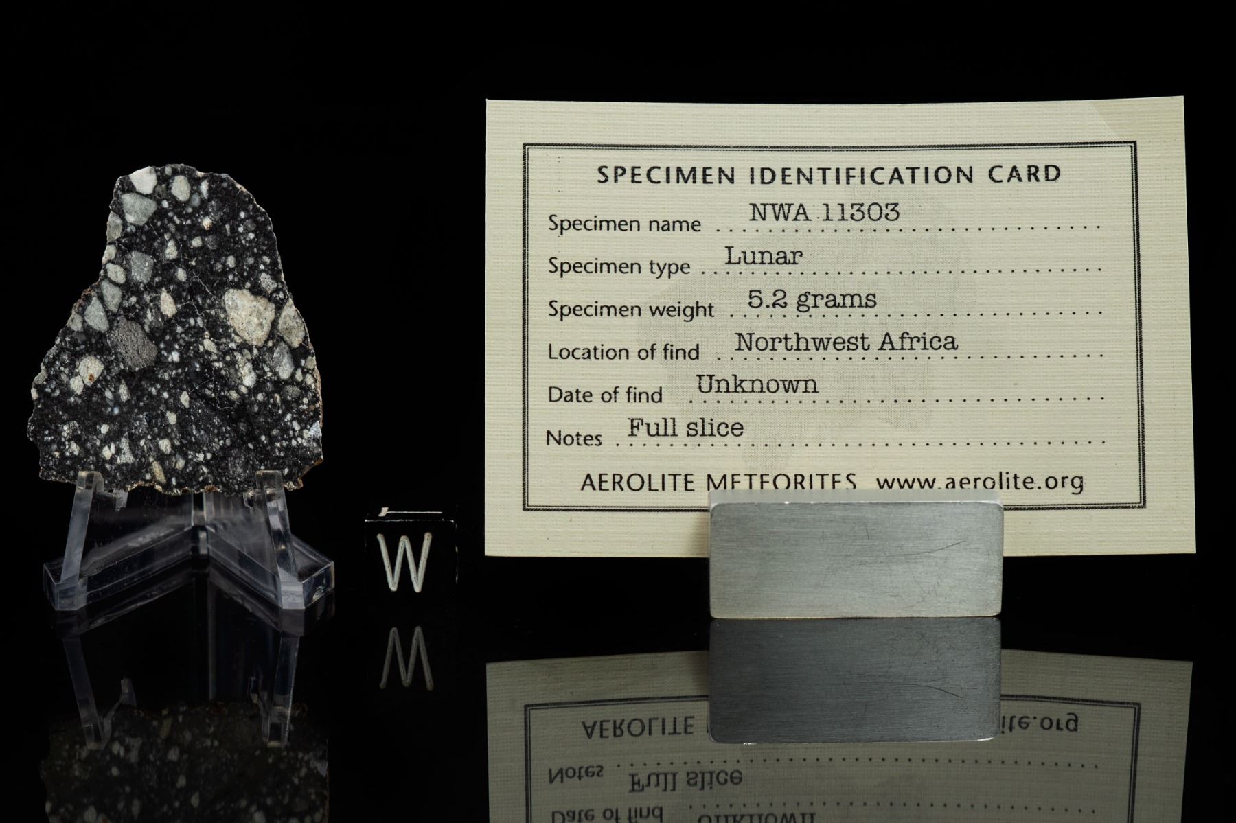 Fabulous Northwest Africa (NWA) 11303 lunar meteorite slice, comprised of lunar feldspathic breccia. The full slice weighs 5.2 grams and measures approximately 38 mm x 33 mm x 2 mm. This is an actual fragment of the moon, identified as a feldspathic regolith breccia by Drs. Irving and Kuehner at the University of Washington. Among the rarest materials on Earth, this lunar meteorite was expertly prepared in the lab, using a special saw to show off its marvelous fragmented (brecciated) interior. Accompanied by a certificate of authenticity signed by Geoff Notkin of Aerolite Meteorites Inc. and the TV show Meteorite Men, as well as a specimen identification card.