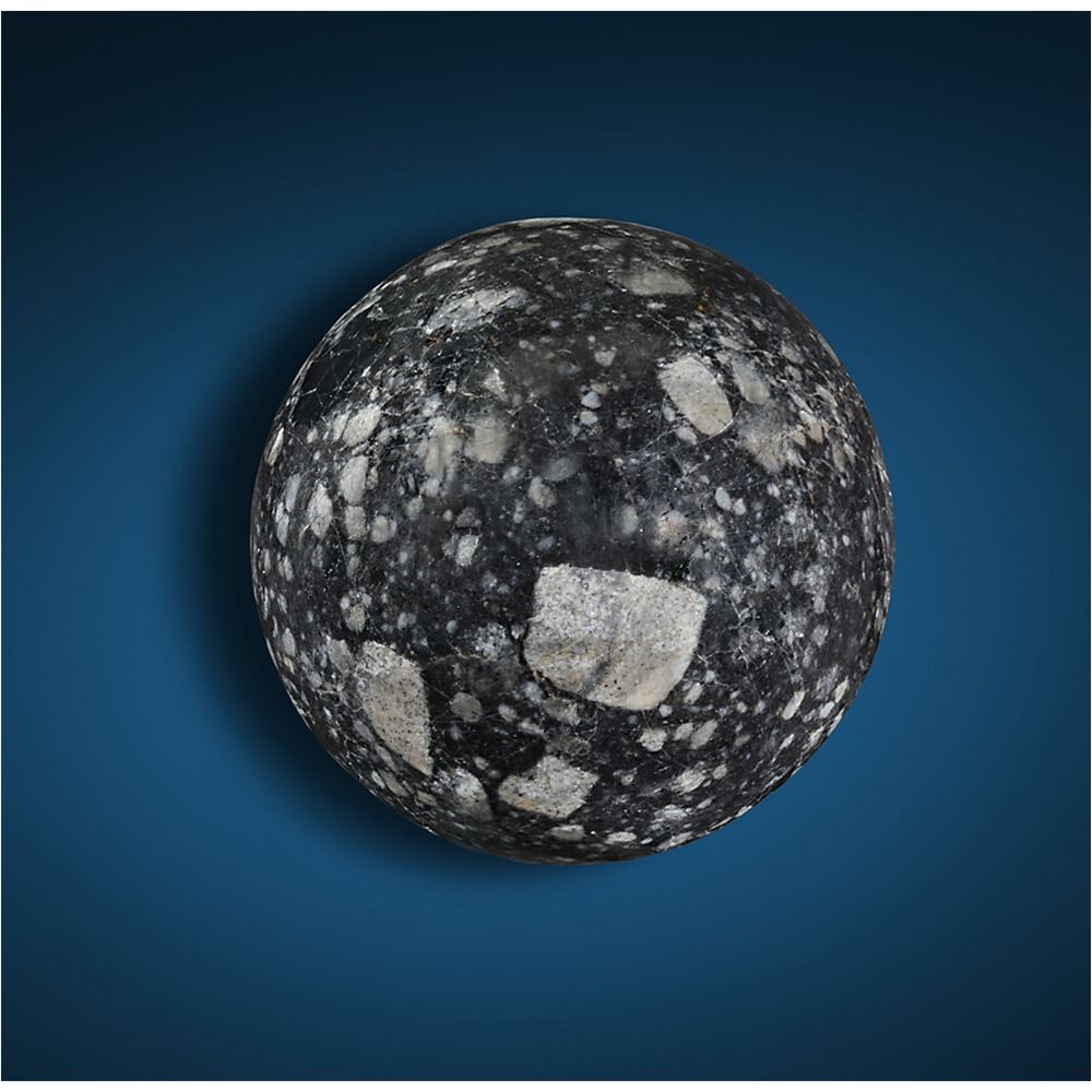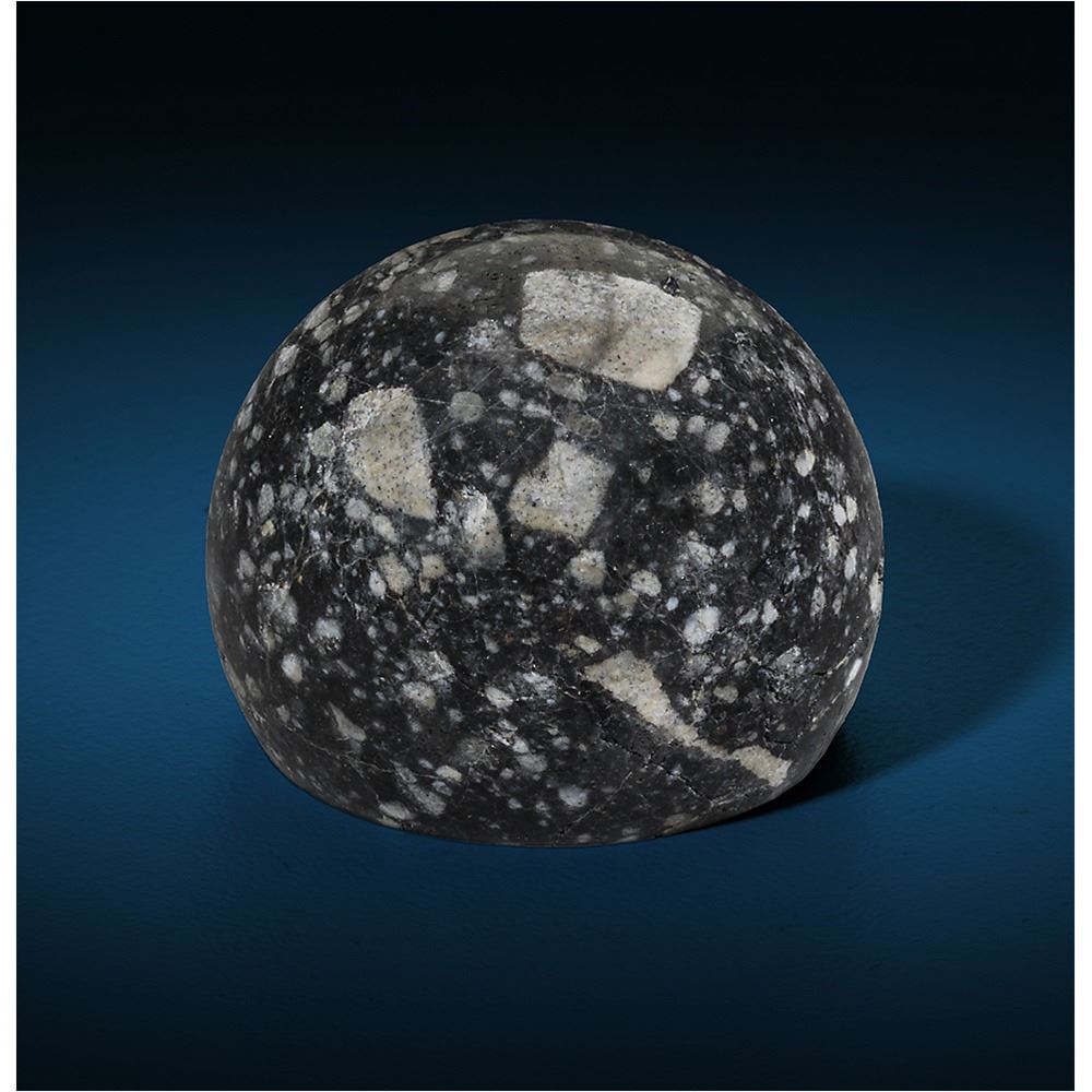 Exceedingly similar to the previous lot, this originates from the same NWA 12691 event but it has been fashioned into a paperweight-like curiosity; it was a small sphere that had been subdivided. NWA 12691 is a lunar breccia, which means it contains lot of different fragments of different lunar materials naturally 'cemented' together as a result of the pressure and heat generated from repeated impacts on the lunar surface — with one such impact sending this off into space. The prominent white clasts seen are anorthite, which is very rare on Earth but not on the Moon, which are suspended in dark lunar regolith (i.e., lunar soil comprised of pulverized rocks including some volcanic glass, which melted following an asteroid impact and subsequently hardened). Scientists are readily able to identify Moon rocks by analyzing a rock's texture, mineralogy, chemistry and isotopic signatures. As a nice added reference, this specimen is nearly identical to some of the material returned to Earth by Apollo astronauts.