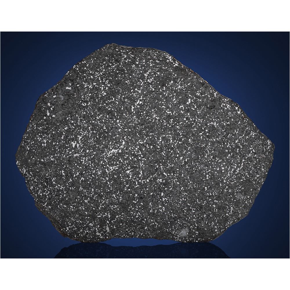 Aubrites have the highest cosmic ray exposure ages of any stony meteorite. They are primarily composed of enstatite and are believed to originate from the asteroid 3103 Eger, a near-Earth Asteroid that spectroscopically bears a striking semblance to aubrites. This exemplary complete slice is filled with grains of metal scattered throughout its blue-grey matrix.