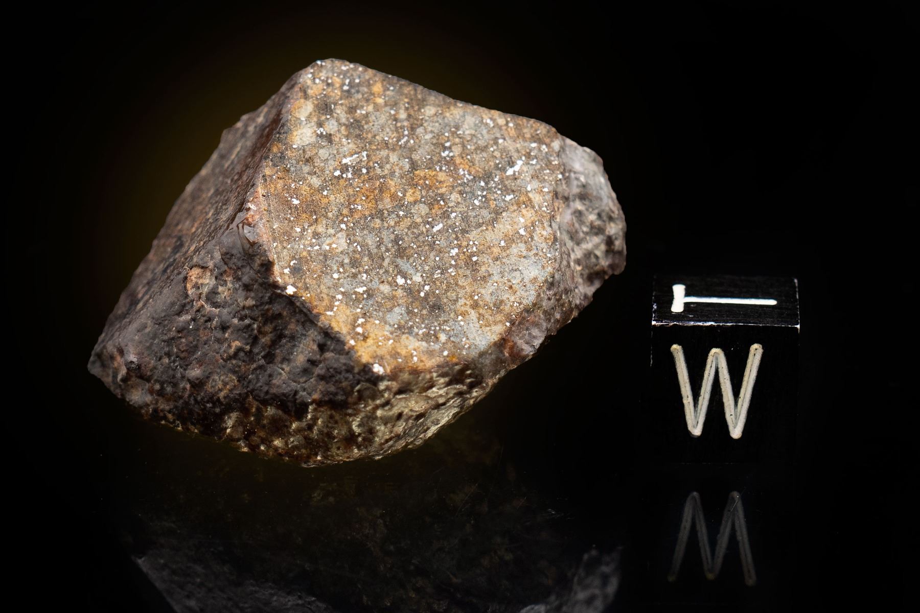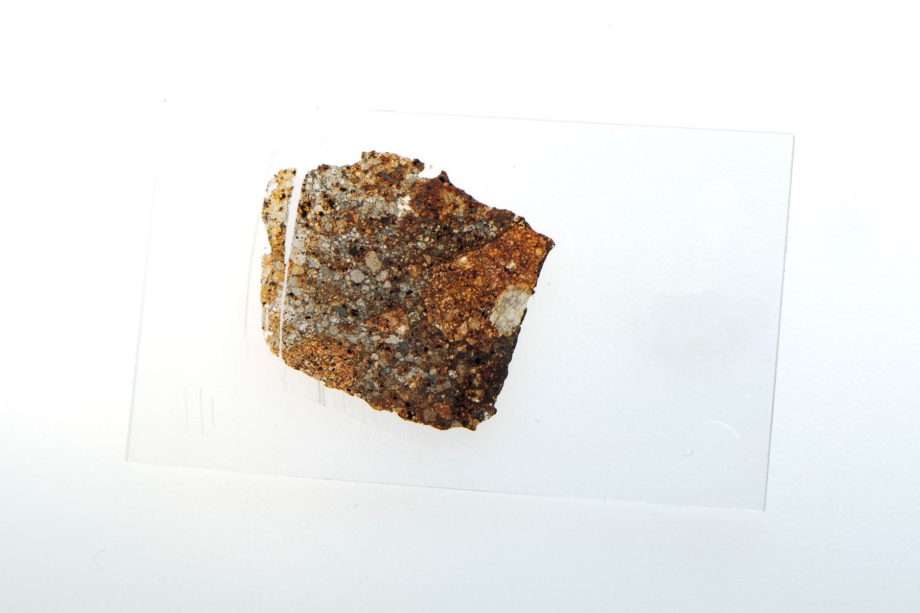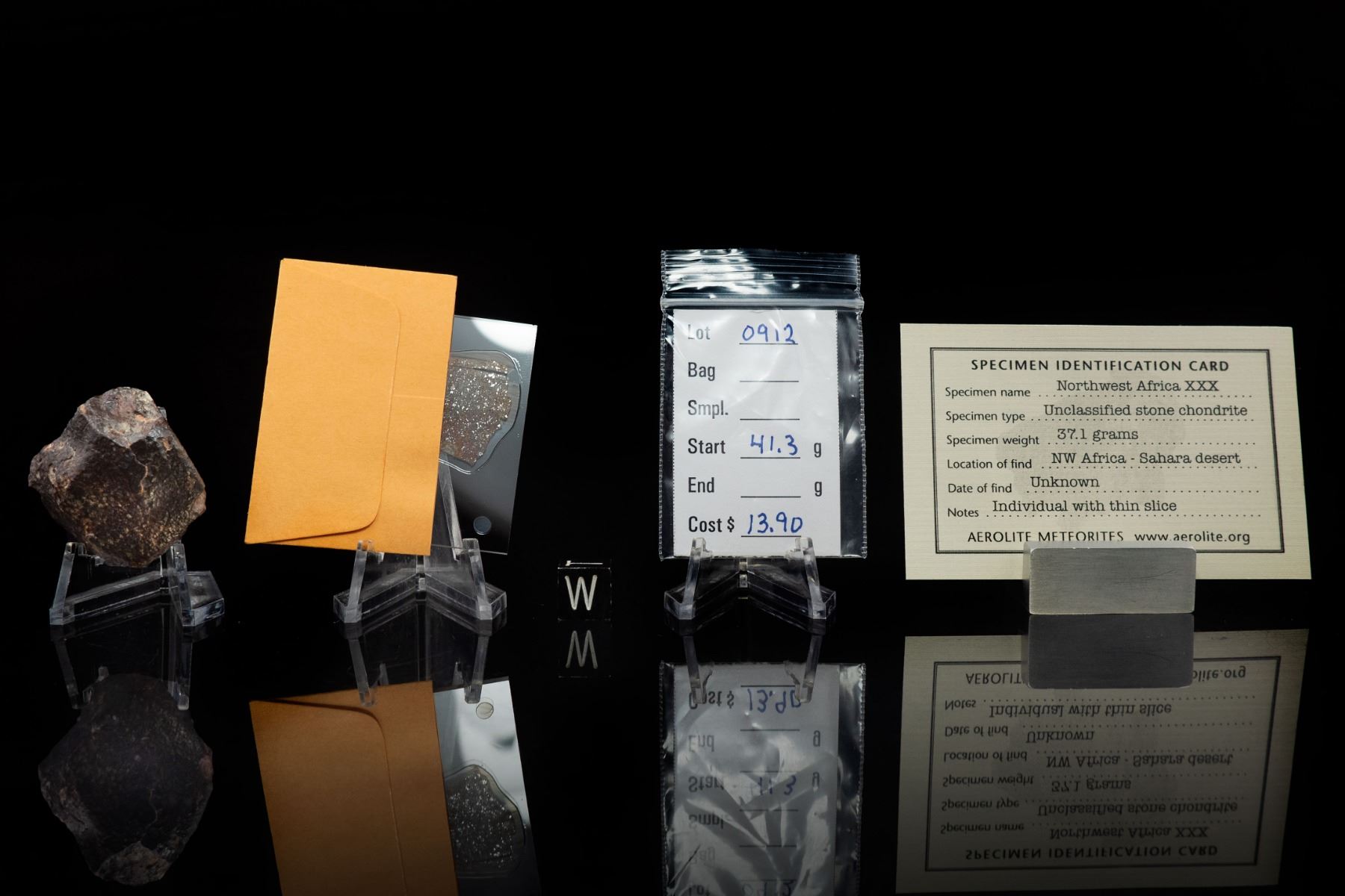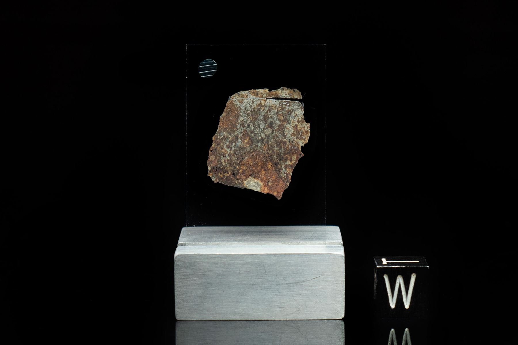 Northwest Africa (NWA) XXX unclassified stone chondrite individual meteorite with a thin slice on a glass slide. The individual weighs 37.1 grams and measures 35 mm x 30 mm x 25 mm. The slice measures 20 mm x 15 mm. Thin sections are an indispensable tool in the process of classifying stone meteorites. Only a handful of people have the necessary skills to prepare these very precise samples. A slice from a stone meteorite is cut thin and then ground so thin that it becomes translucent and is then melted on a glass slide. Examination of the slide shows the petrologic composition of the minerals. A special saw and exacting skills are required to prepare thin sections. These intriguing thin sections and window stone pairs are a fascinating look into the process of meteorite classification and identification. Accompanied by a certificate of authenticity signed by Geoff Notkin of Aerolite Meteorites Inc. and the TV show Meteorite Men, as well as a specimen identification card.