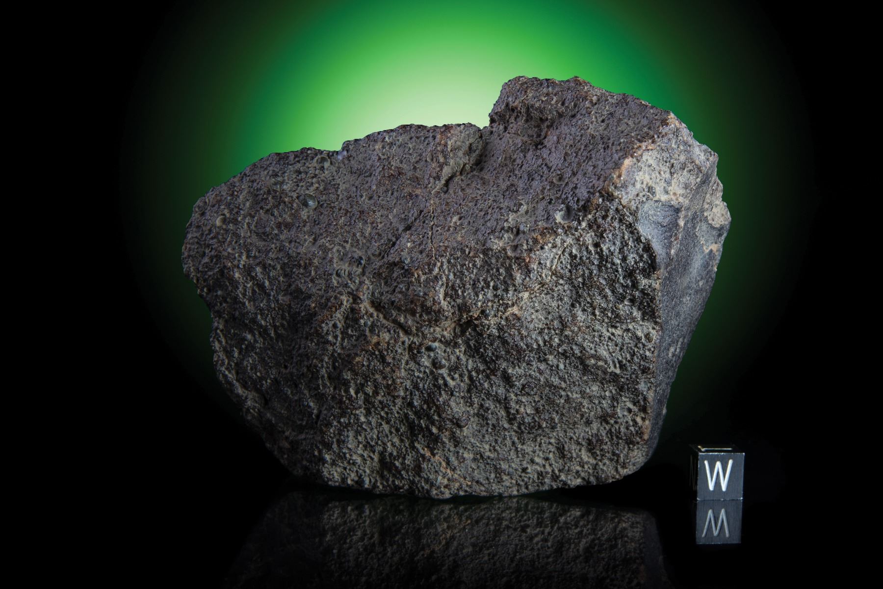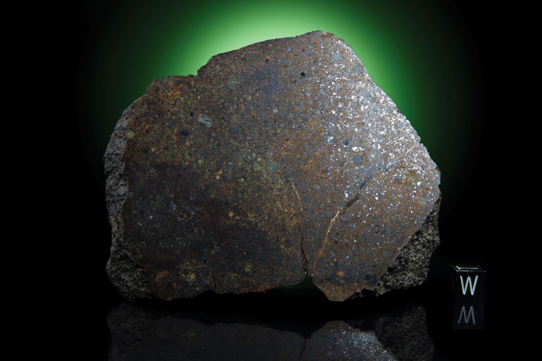 Stone meteorite, chondrite, unclassified. Northwest Africa, found circa 1999. Half stone with polished face and abundant chondrules weighing 607.5 grams and measuring 112 mm x 89 mm x 38 mm. Official numbers and names are assigned only to meteorites that have gone through the complex and time-consuming process of classification by an accredited laboratory. There are only a small number of labs in the world authorized to do this type of specialized work. As resources are limited, finders/owners sometimes elect not to go through the classification process and, instead, assign an unofficial designation, like “NWA XXX” to a particular meteorite. Such is the case with this attractive half stone of 607.5 grams. The exterior shows patches of black fusion crust, while the interior is rich in colorful chondrules of widely varying size and color.