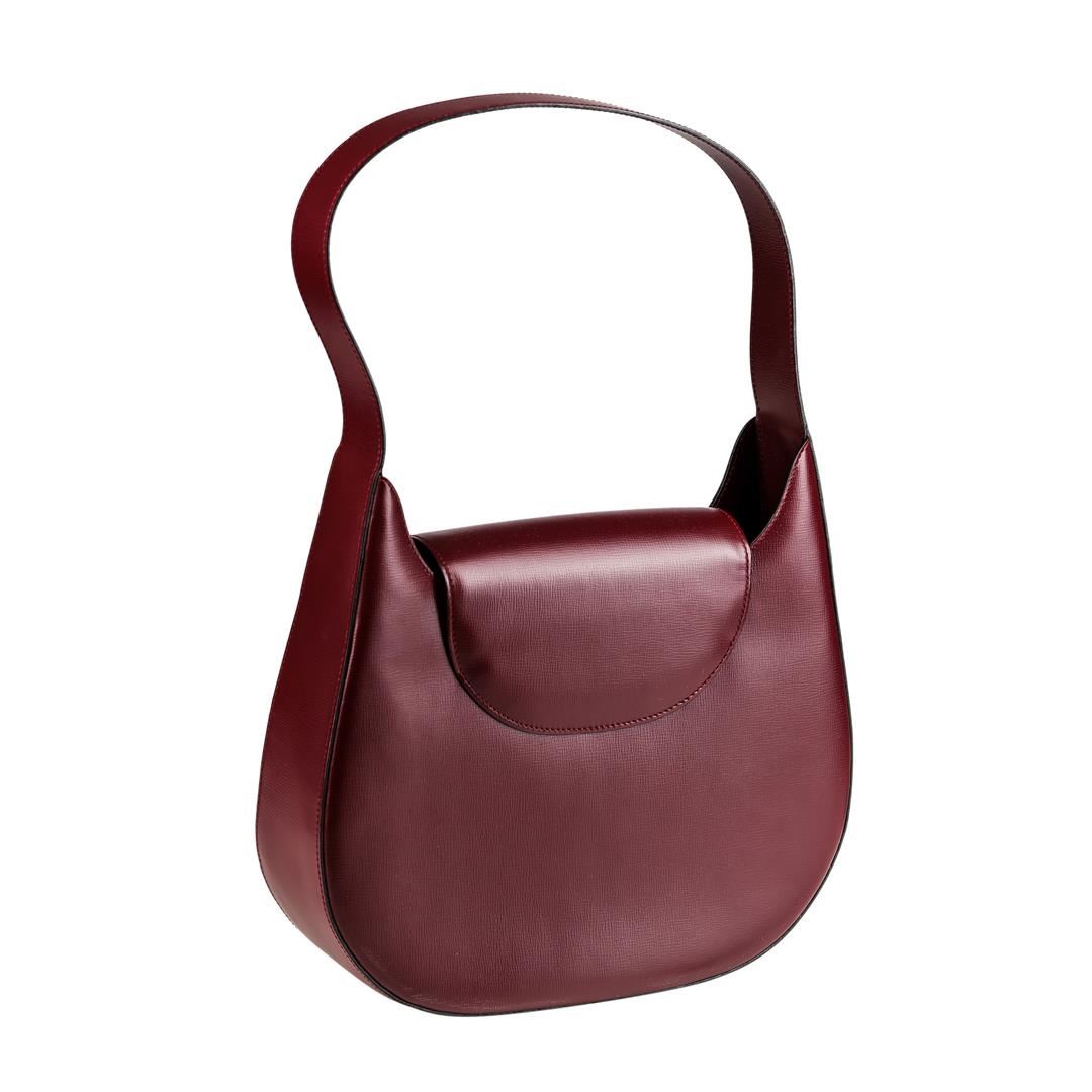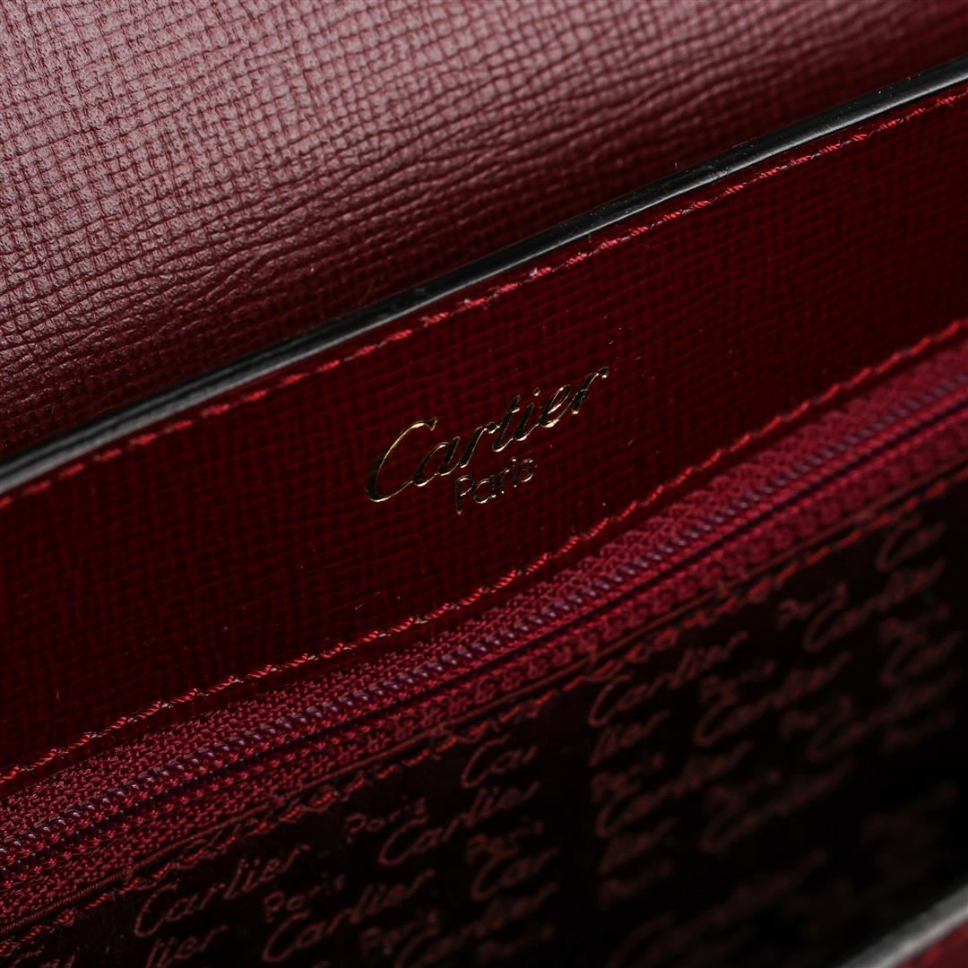 Stunning 100% Authentic Cartier Shoulder Bag in rich Bordeaux Red Leather comes complete with original Box. Unique style fits comfortably on your shoulder. Cartier logo closure opens to an exterior pocket and large interior compartment which features Cartier logo textile lining a zippered pocket and D-ring for keys. Cartier Paris is stamped on the inside. Gold-tone hardware. Like new Condition. Please see photos.