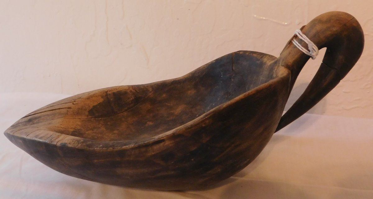 NWC Bird Effigy Ladle, circa 1920s. Made of wood and paint, the item is 12.5" x 7" x 4.5". Canada. Bird effigy, nice carving. Condition: Nice, some wear, see images. Shipping: $30.00 w/insurance and signature, double-boxed.