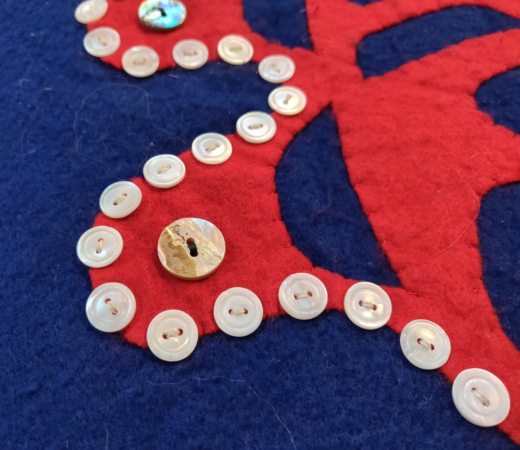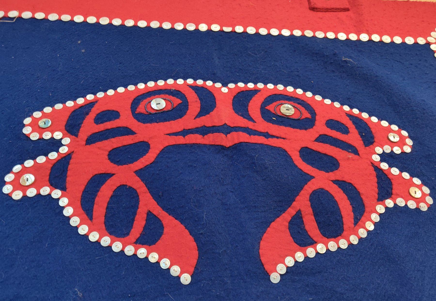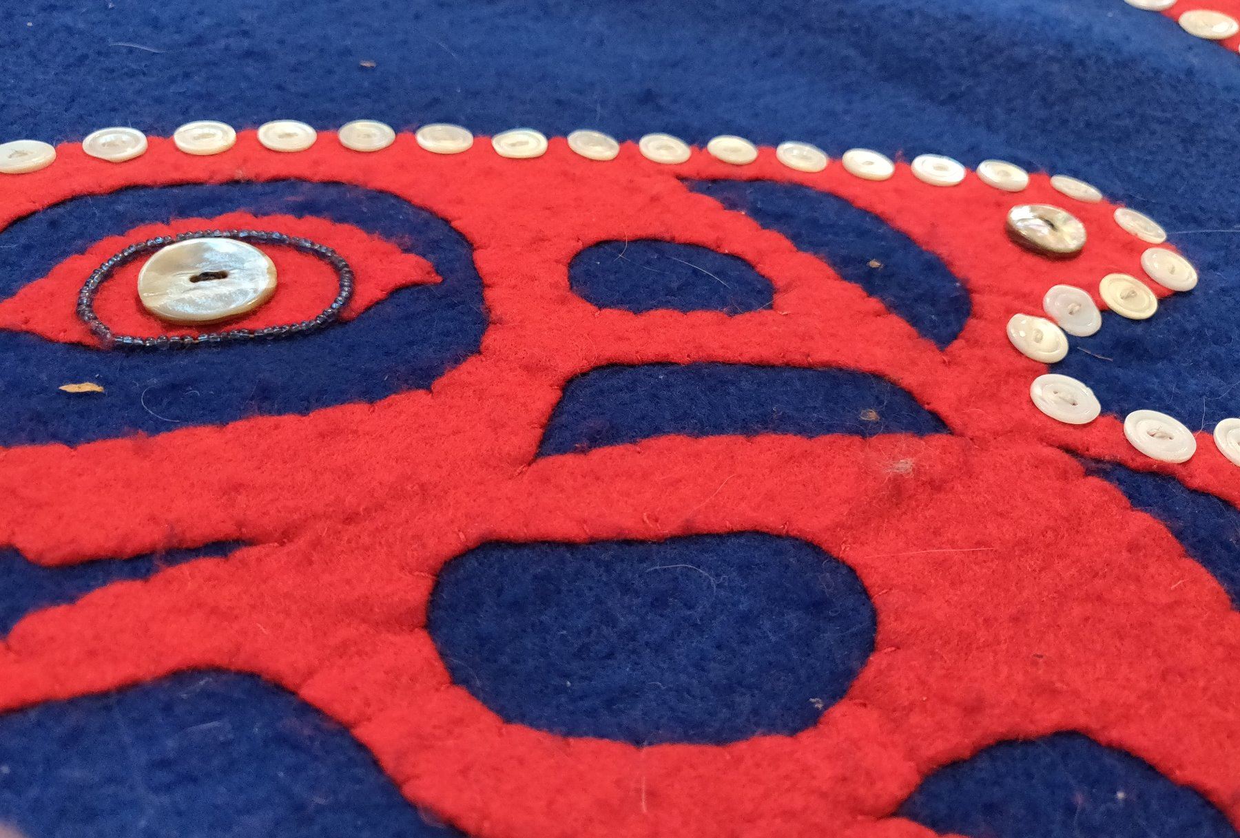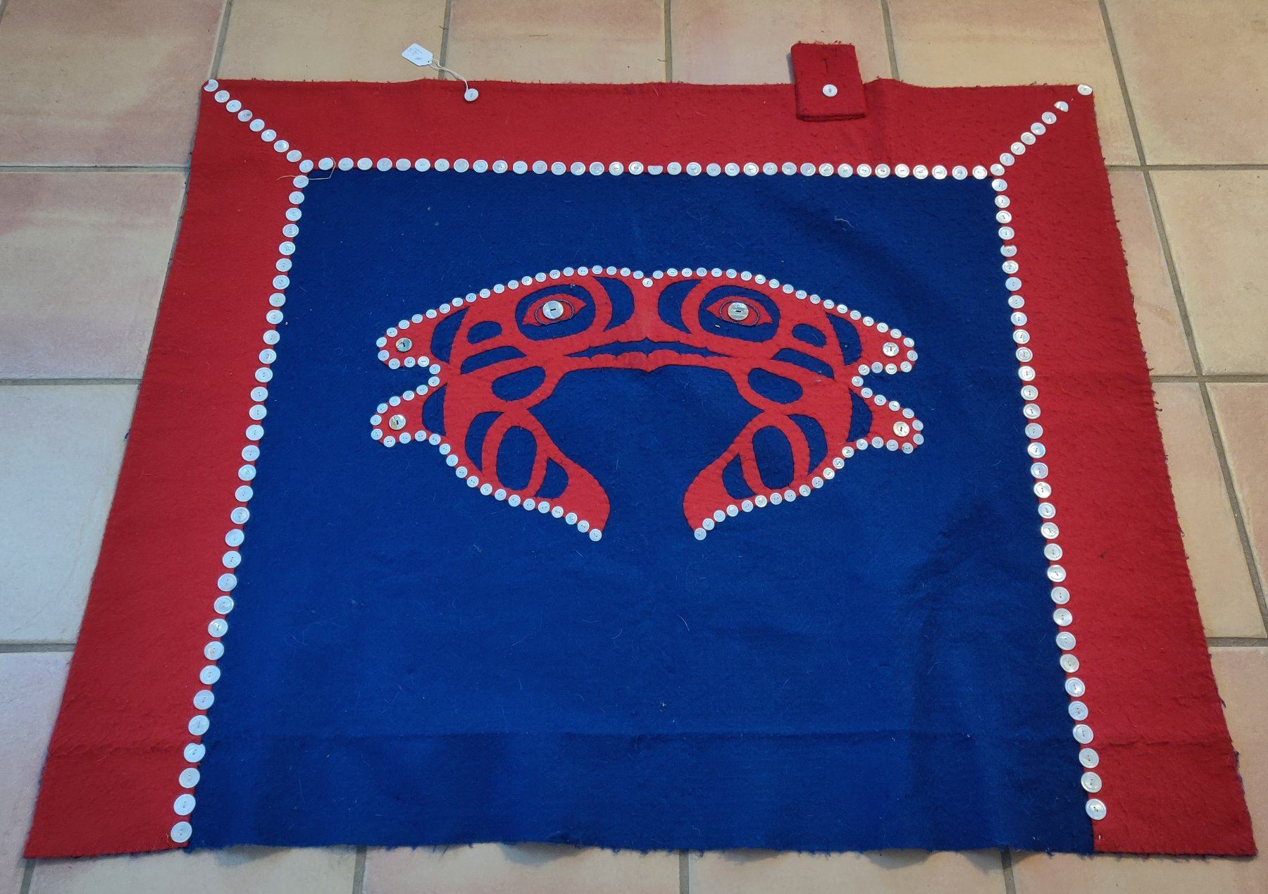 Northwest Coast Button Blanket, c. 1950s. Made of shell and wool, the item measures 46" x 36". Northwest Coast, Canada. Condition: Some buttons have chips, see images. Shipping: $24.50 w/insurance and signature.