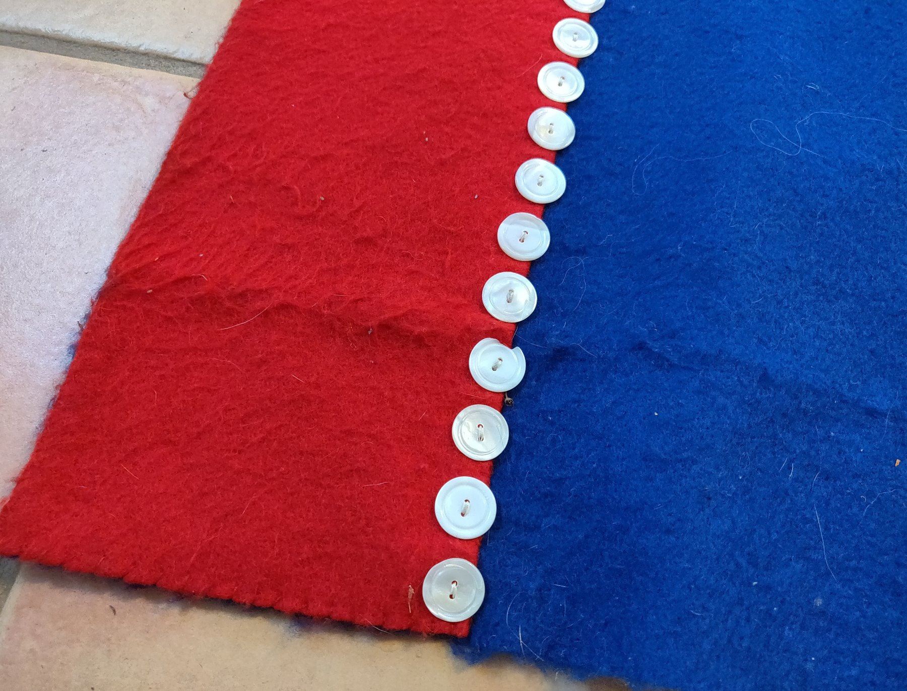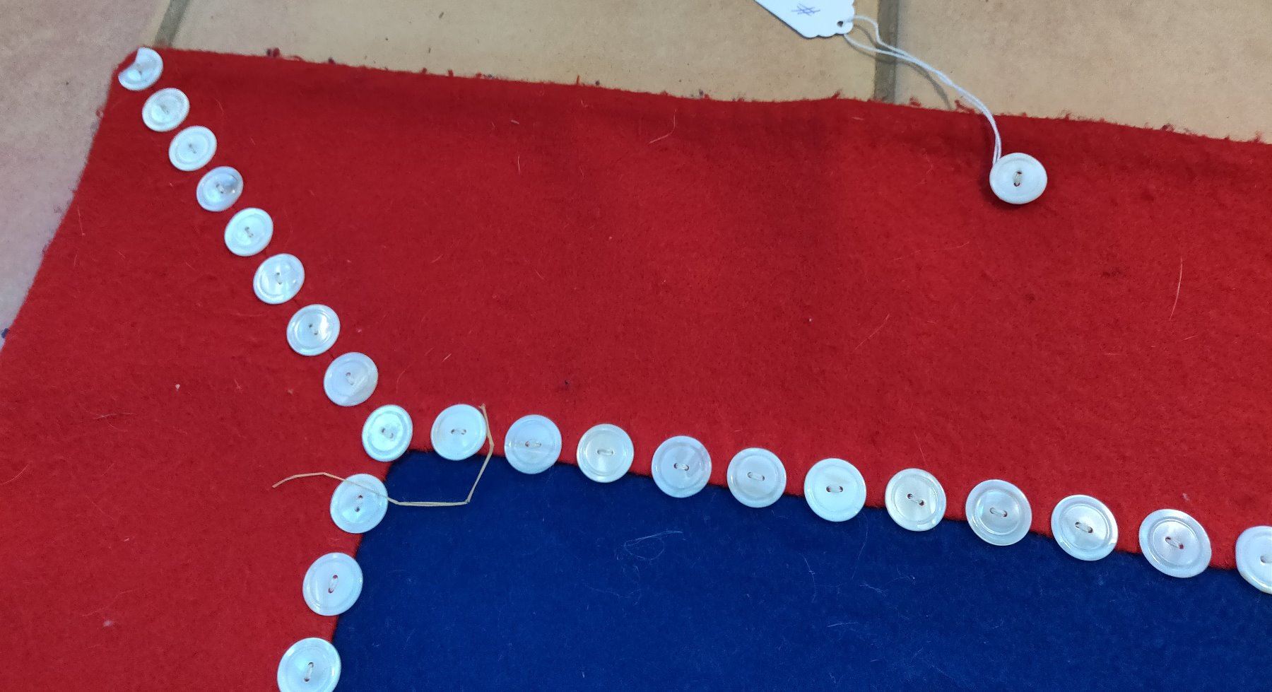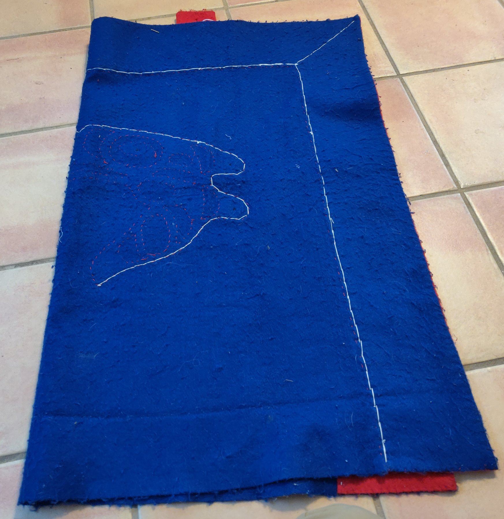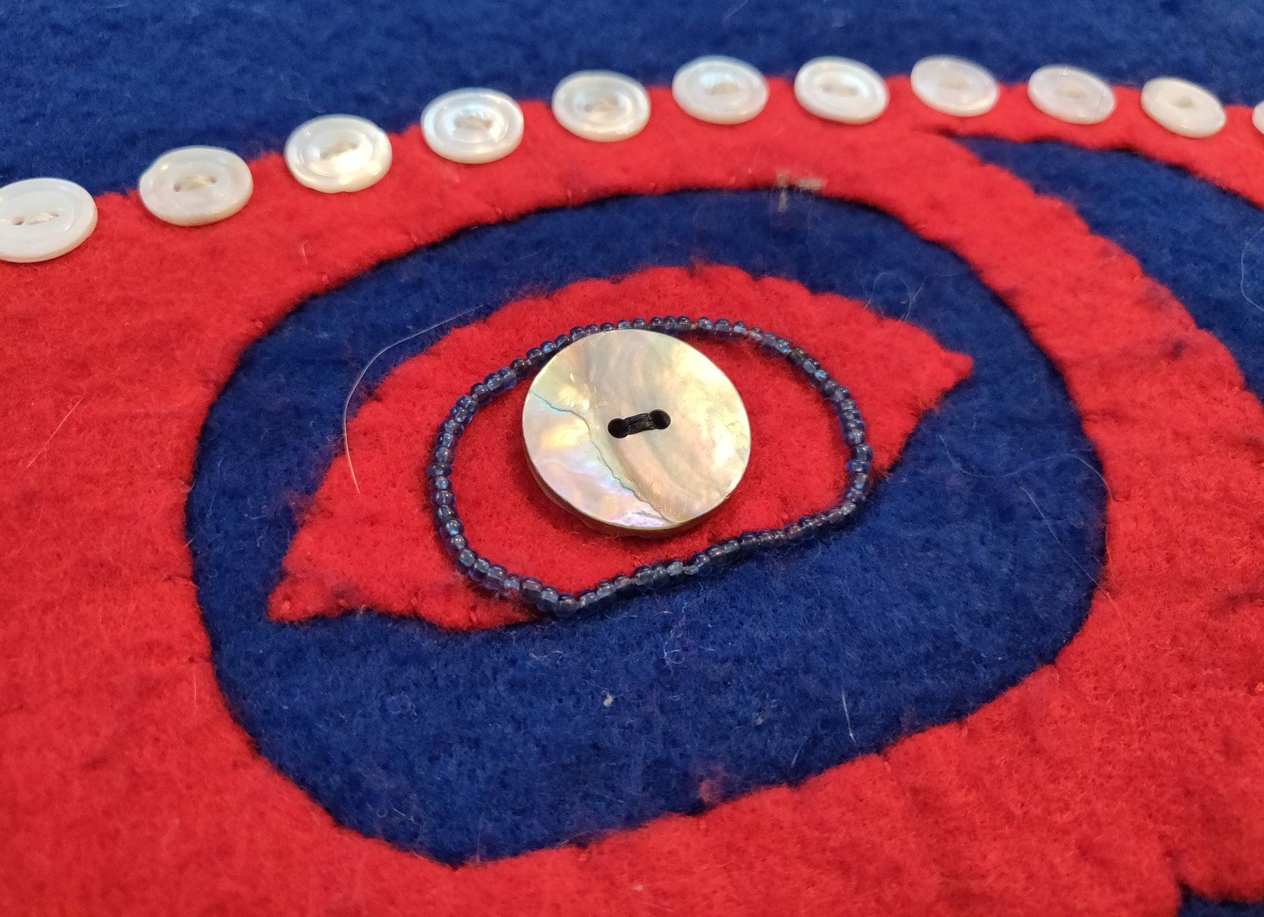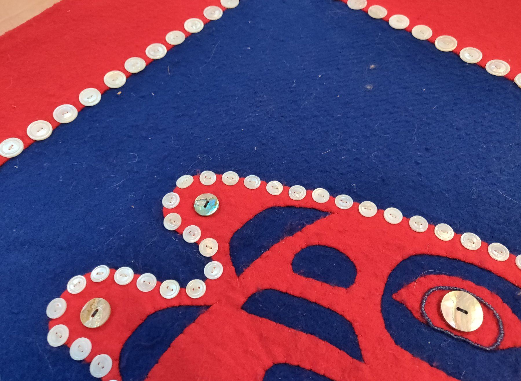 Northwest Coast Button Blanket, c. 1950s. Made of shell and wool, the item measures 46" x 36". Northwest Coast, Canada. Condition: Some buttons have chips, see images. Shipping: $24.50 w/insurance and signature.