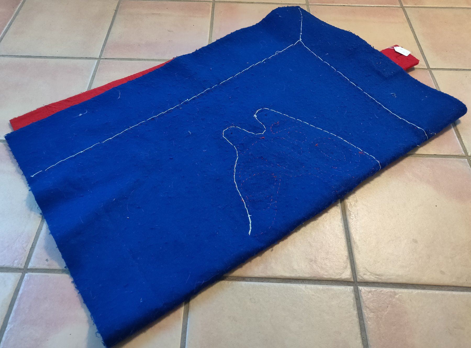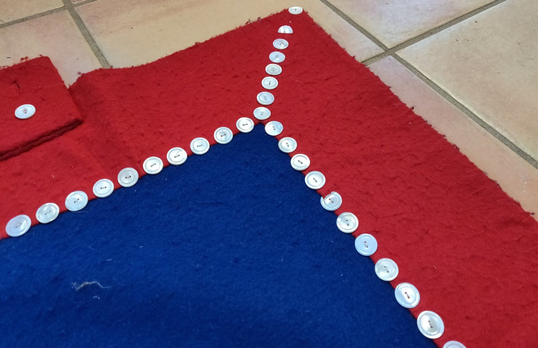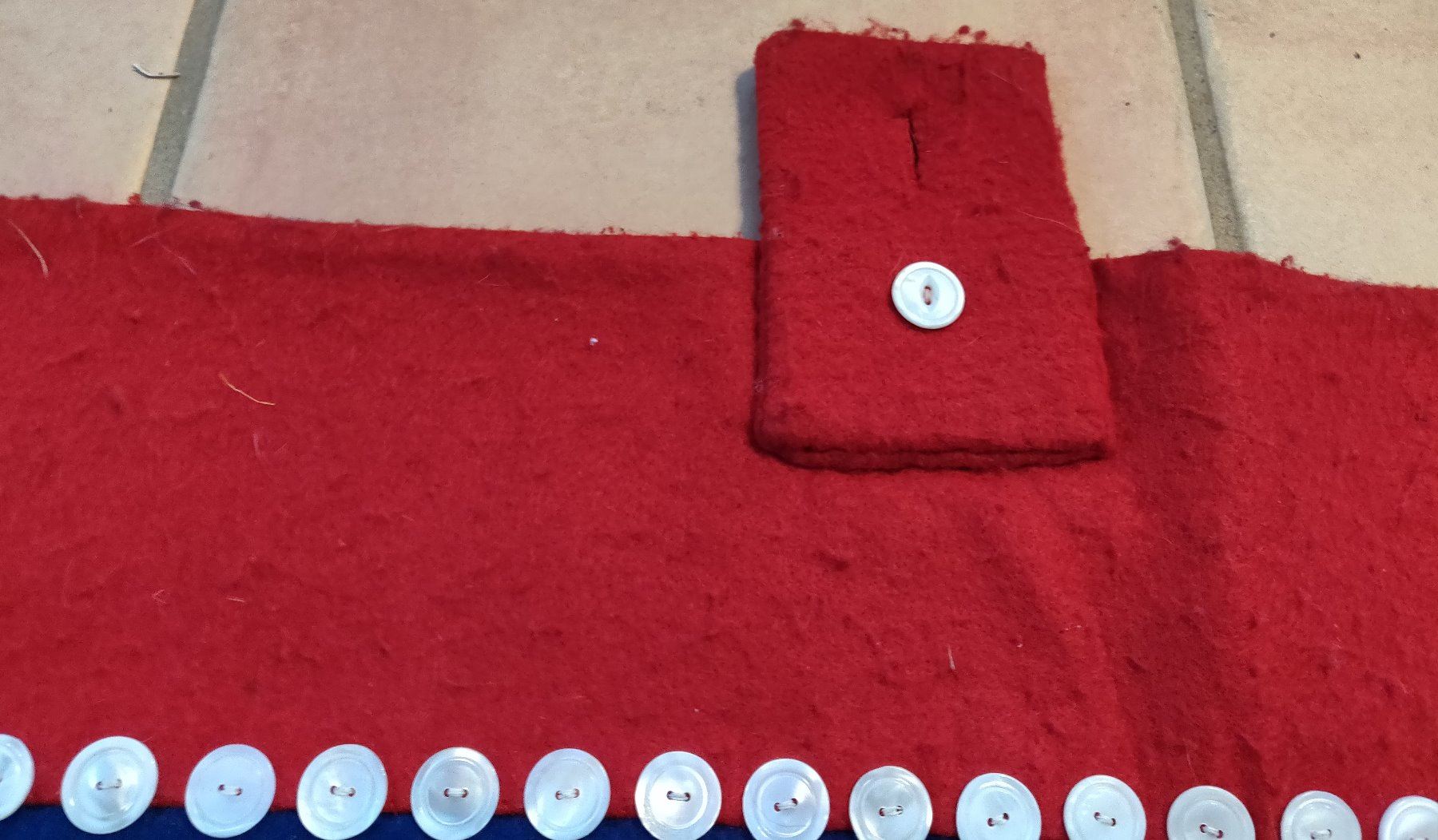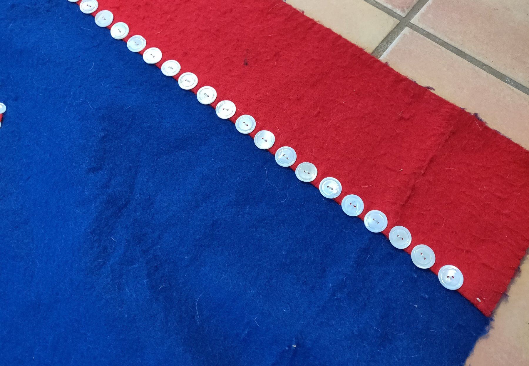 Northwest Coast Button Blanket, c. 1950s. Made of shell and wool, the item measures 46" x 36". Northwest Coast, Canada. Condition: Some buttons have chips, see images. Shipping: $24.50 w/insurance and signature.