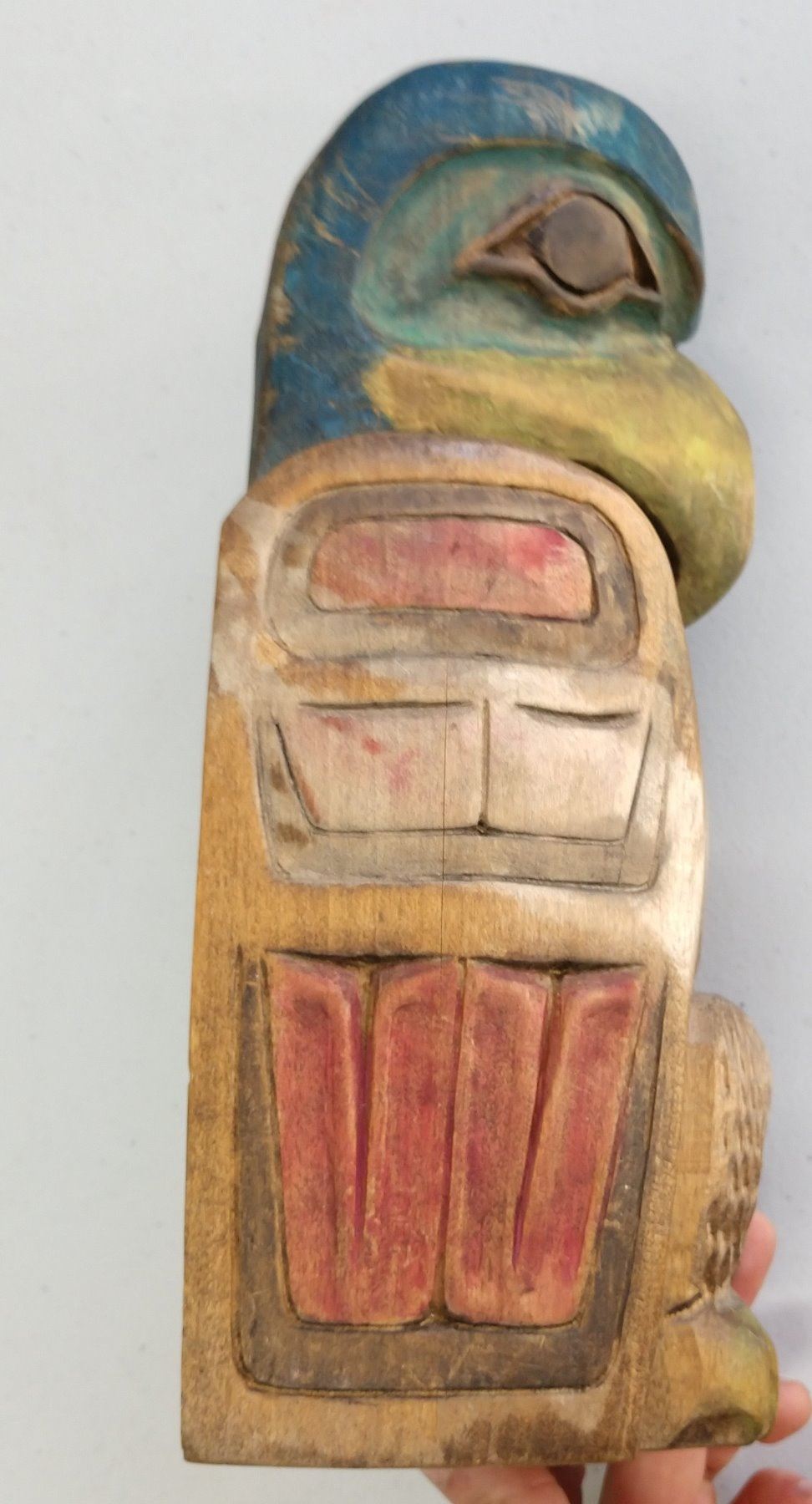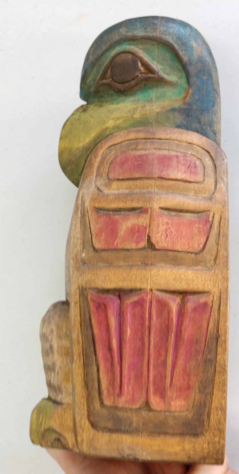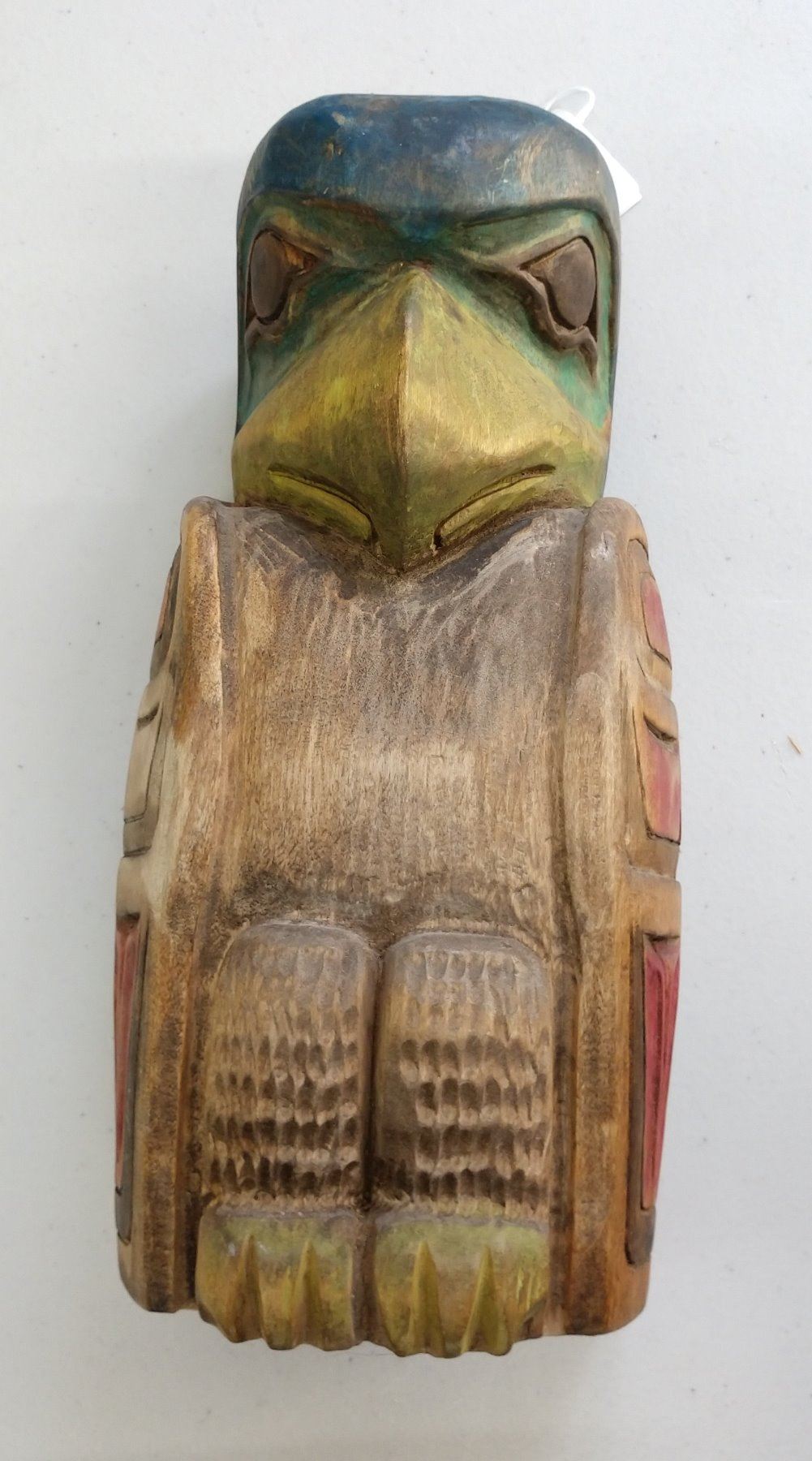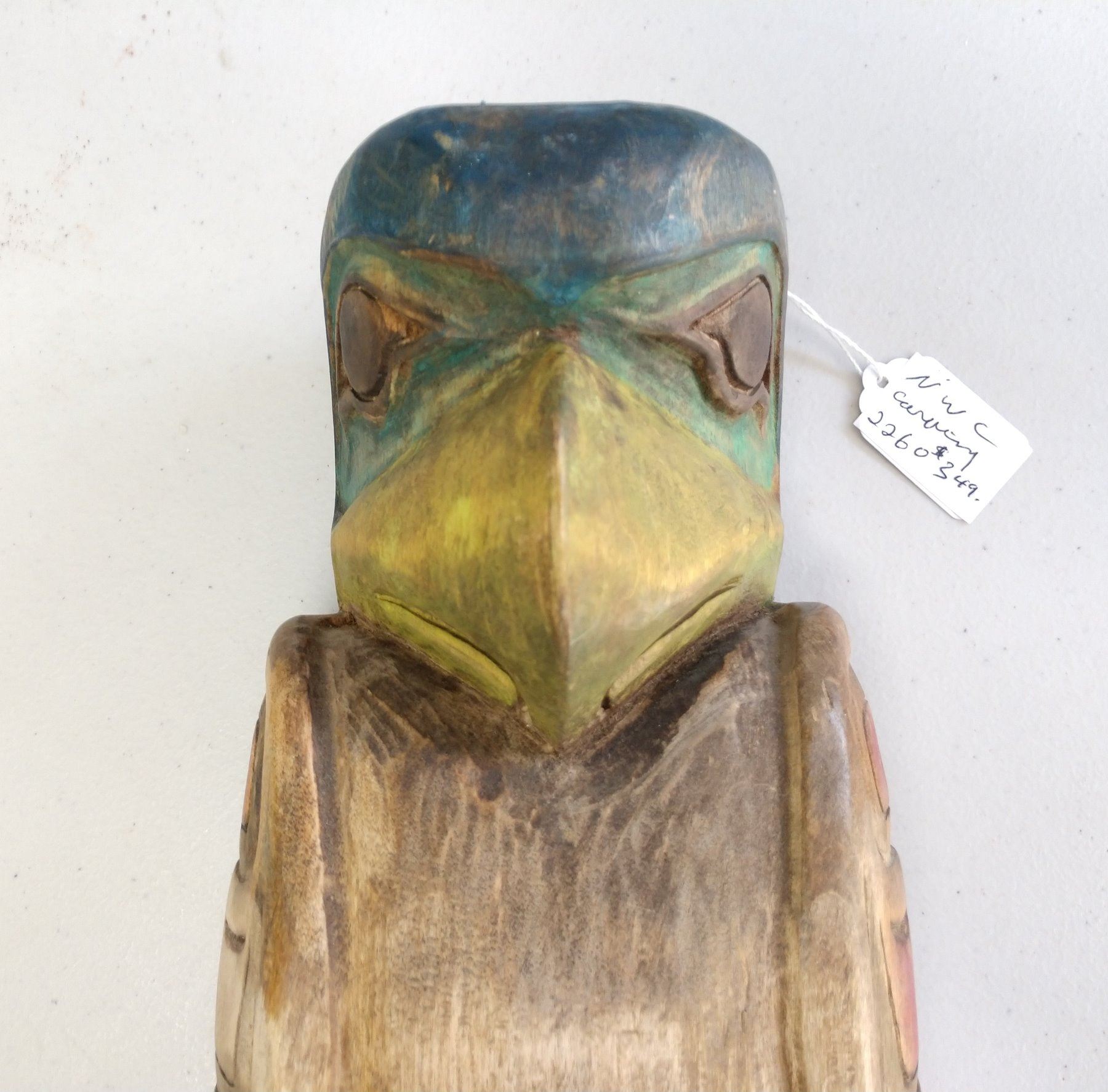 Northwest Coast Carved Eagle, c. 1960s. Made of alder wood and paint, the item measures 11 1/2" x 5" x 4". Canada. Nice colors. Condition: Good, see images. Shipping: $28.50 w/insurance and signature, due to size and weight.