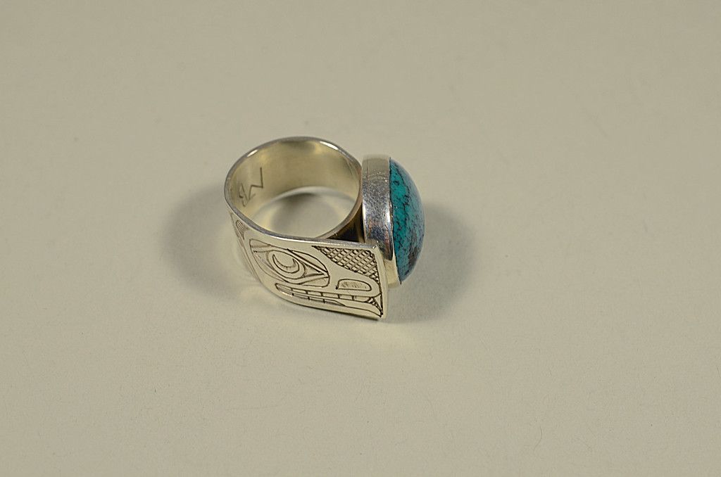NWC Native Carved Silver Ring with Turquoise by Barry Wilson Haisla - Kemano, B.C. Excellent , Like-new condition.