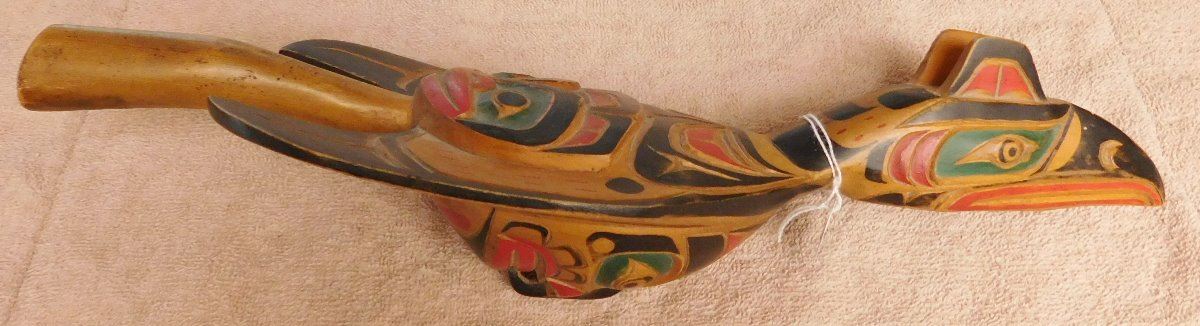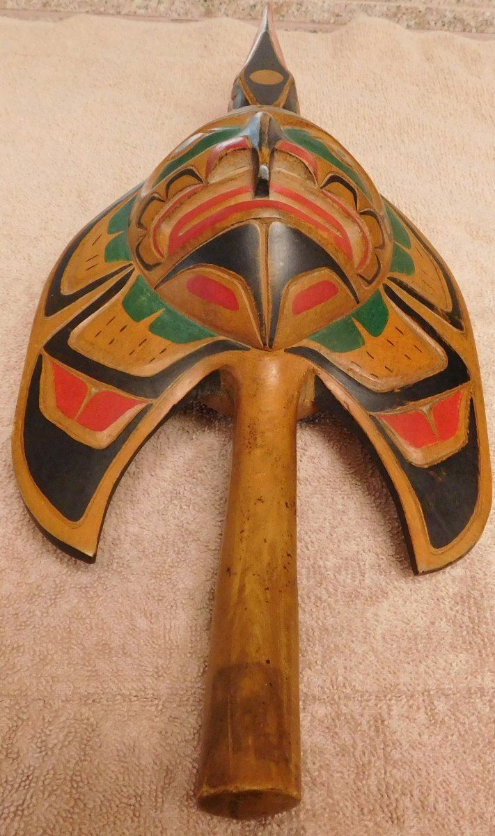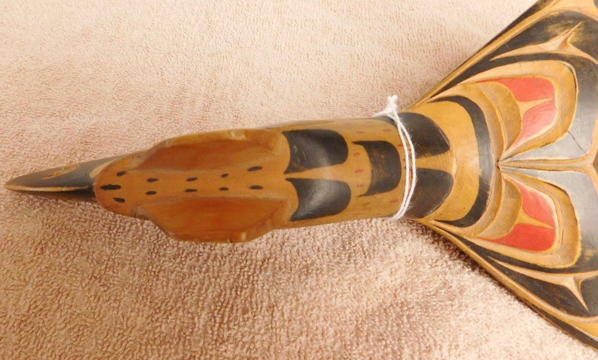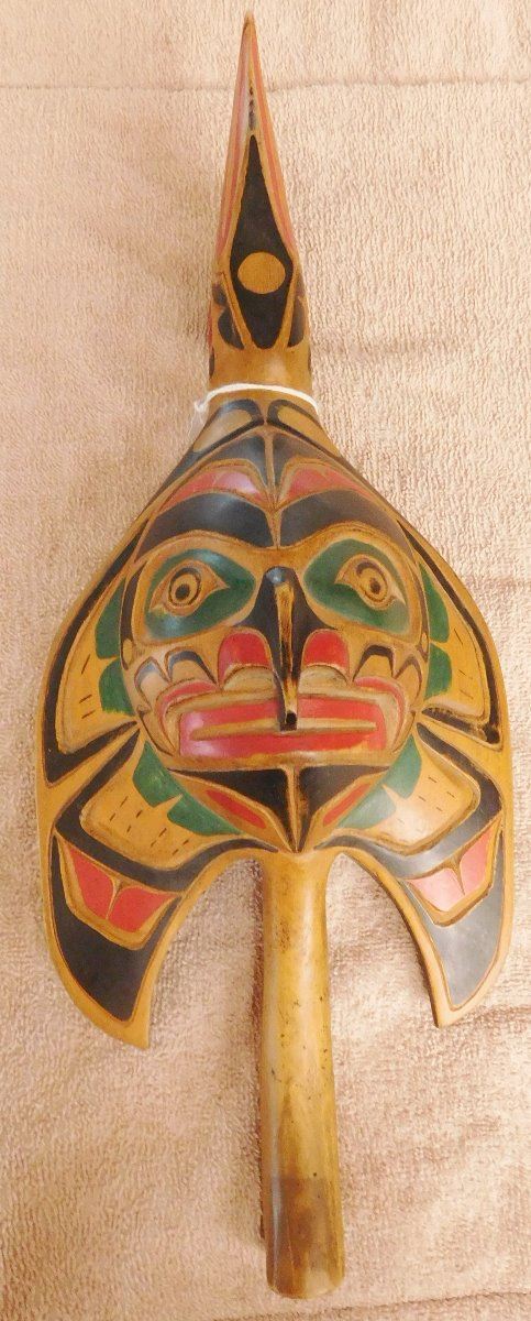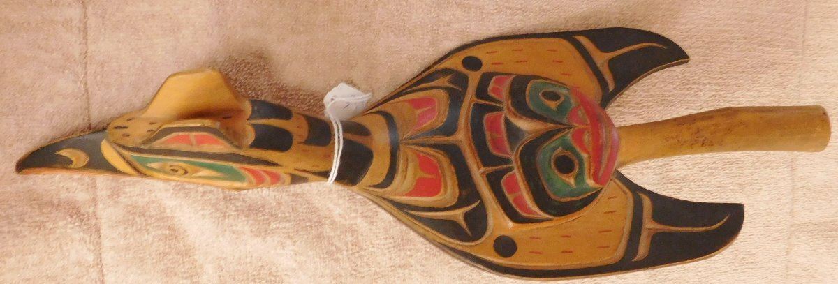 NWC Raven Rattle, circa 1940s. Made of white cedar and paint, the item is 16" x 6" x 3". Kwakiutl. Museum quality northwest coast art. Fine paint! Nice sound. Condition: Fine, see images. Shipping: $40.00 w/insurance and signature, double-boxed, due to value and length.