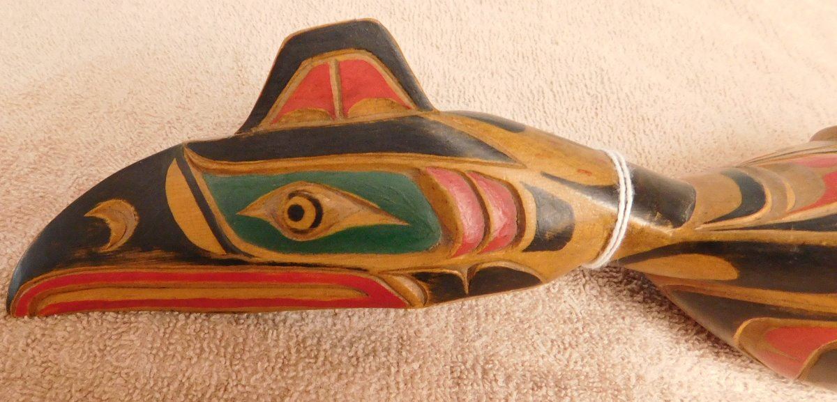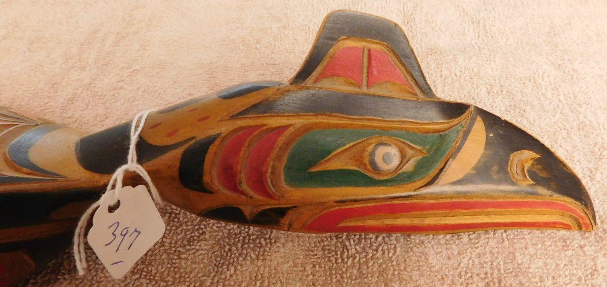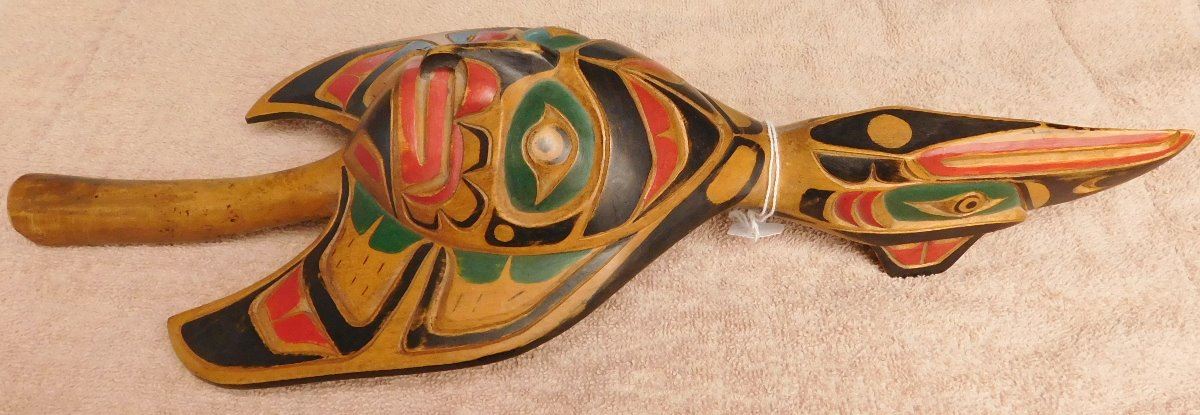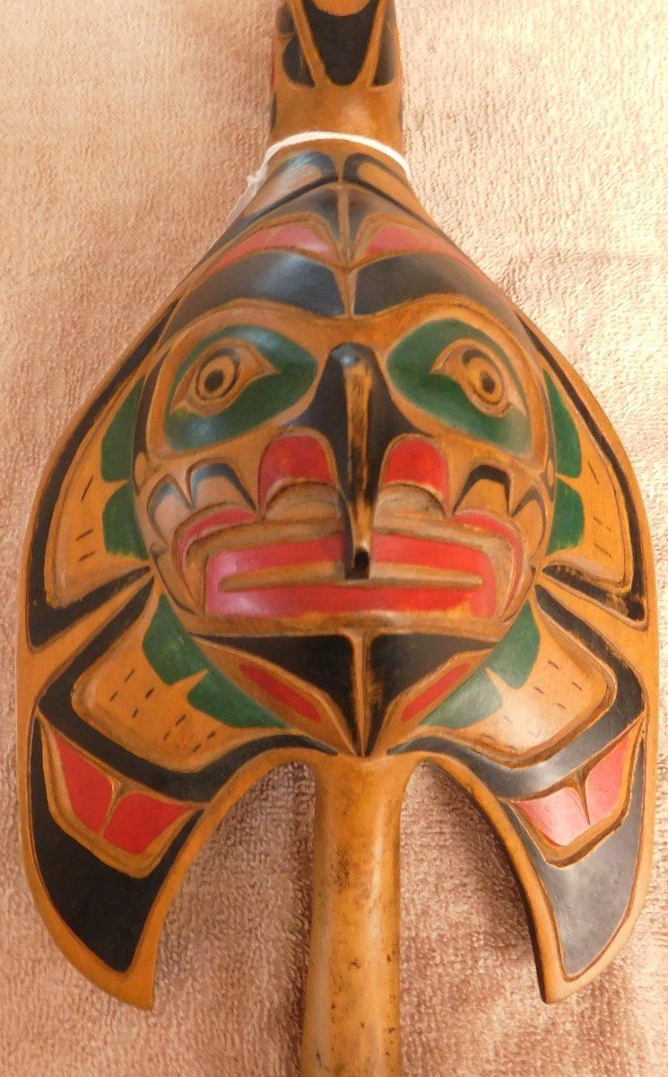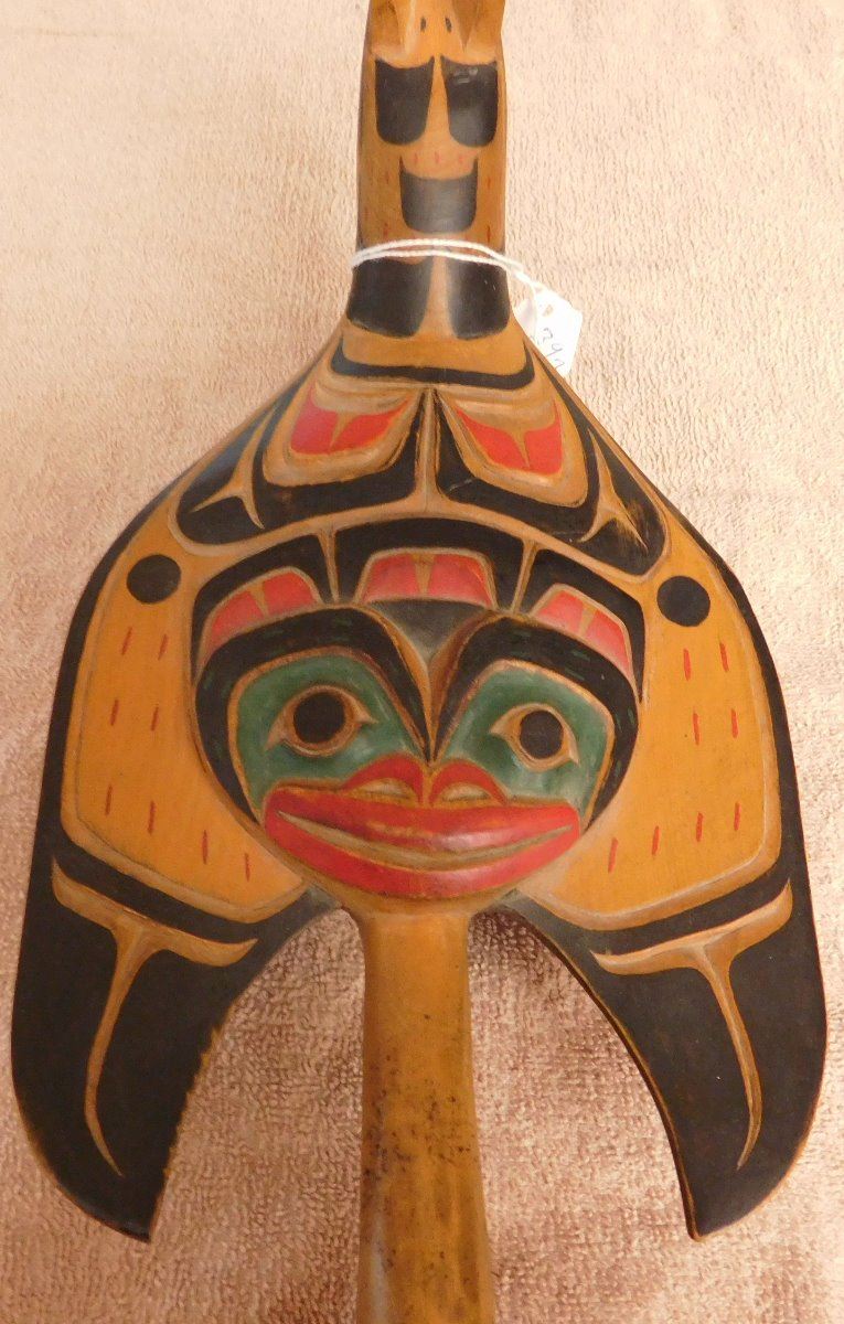 NWC Raven Rattle, circa 1940s. Made of white cedar and paint, the item is 16" x 6" x 3". Kwakiutl. Museum quality northwest coast art. Fine paint! Nice sound. Condition: Fine, see images. Shipping: $40.00 w/insurance and signature, double-boxed, due to value and length.