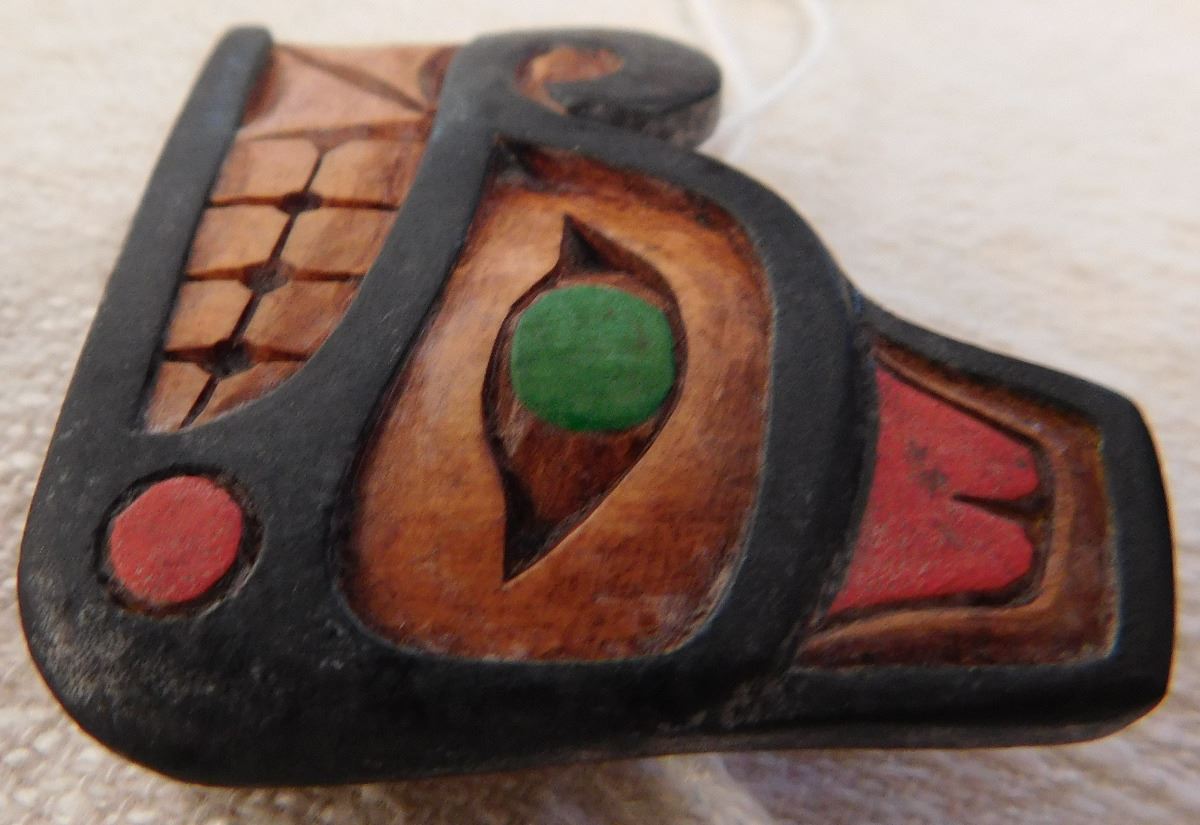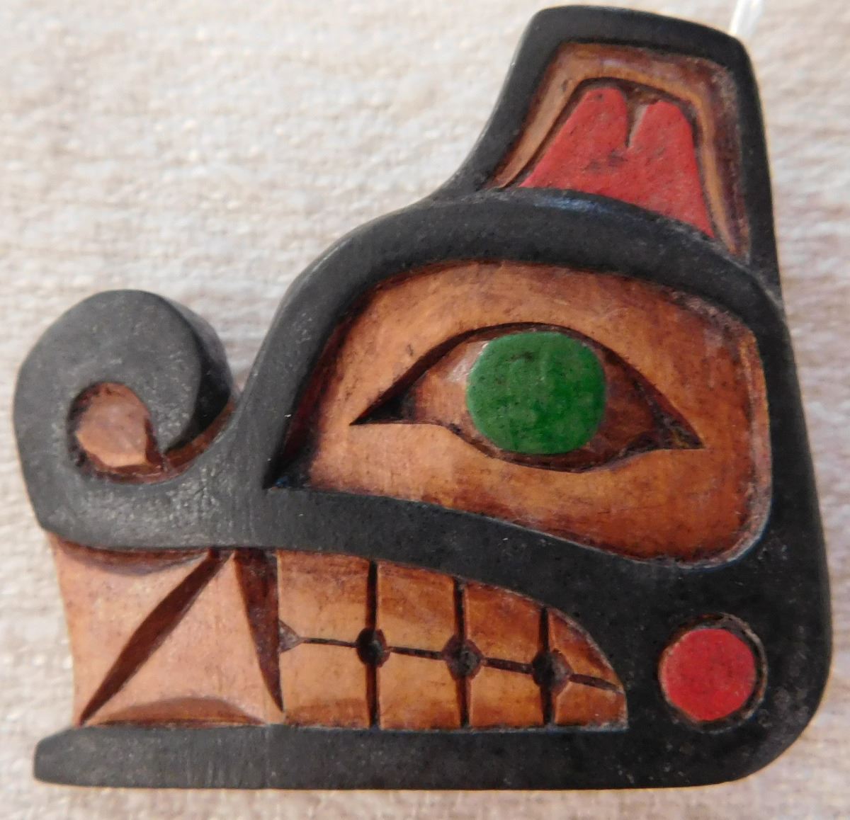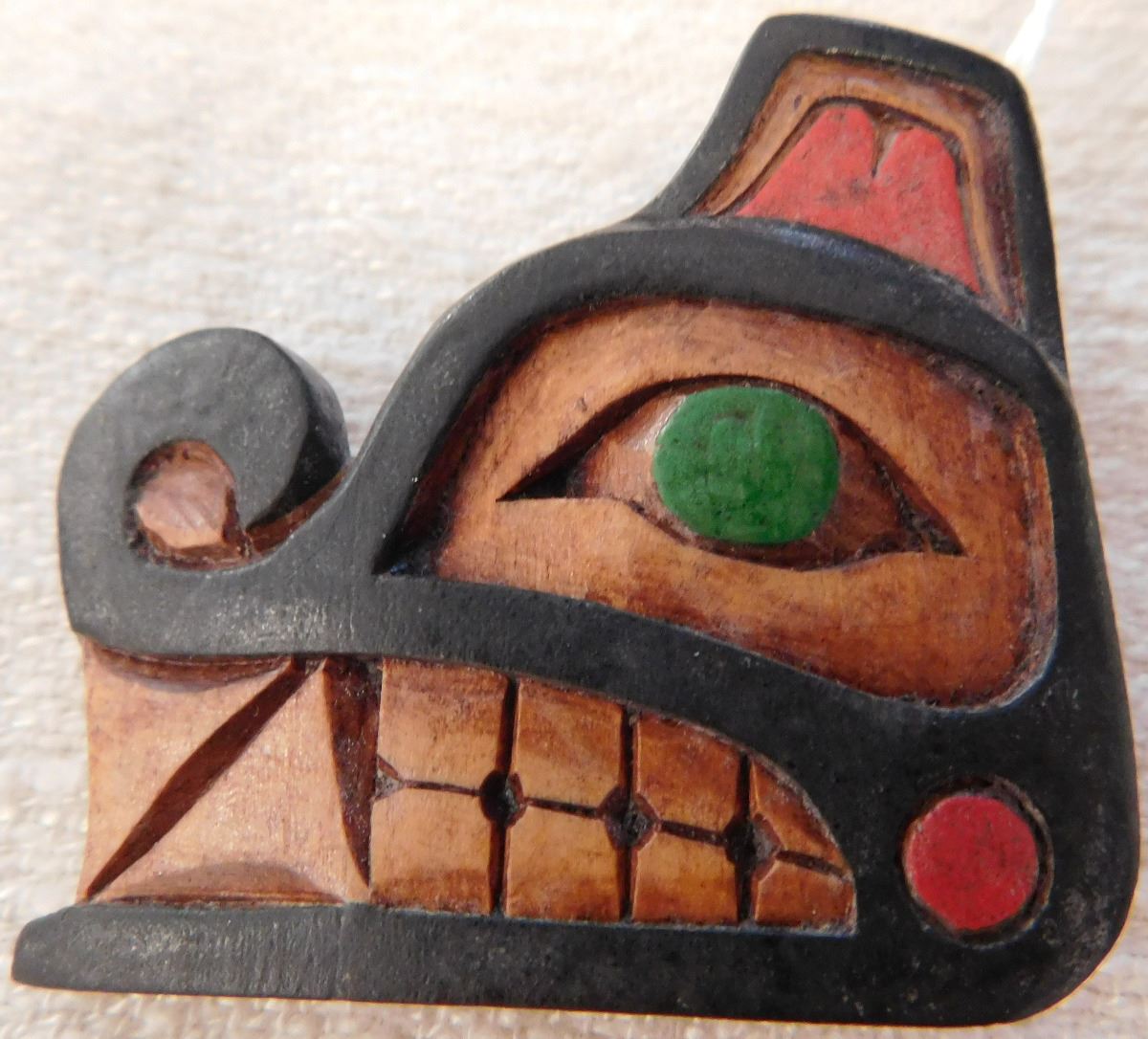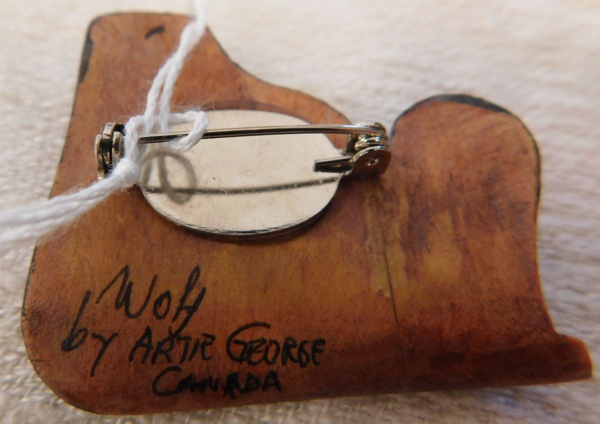 NWC Wolf Pin + NWC-style Sterling Raven Pin, circa 1990s. Made of wood and paint, Artie George's Wolf measures 1 7/8" x 1 3/4". Other pin included is sterling silver and possibly jet, a perched Raven pendant weighing approx. 5 grams. Raven pendant measures 5/8" x 1 1/2" x 1/4". Canada. Condition: Good, pre-owned, see images. Shipping: $14.50 w/insurance and signature.