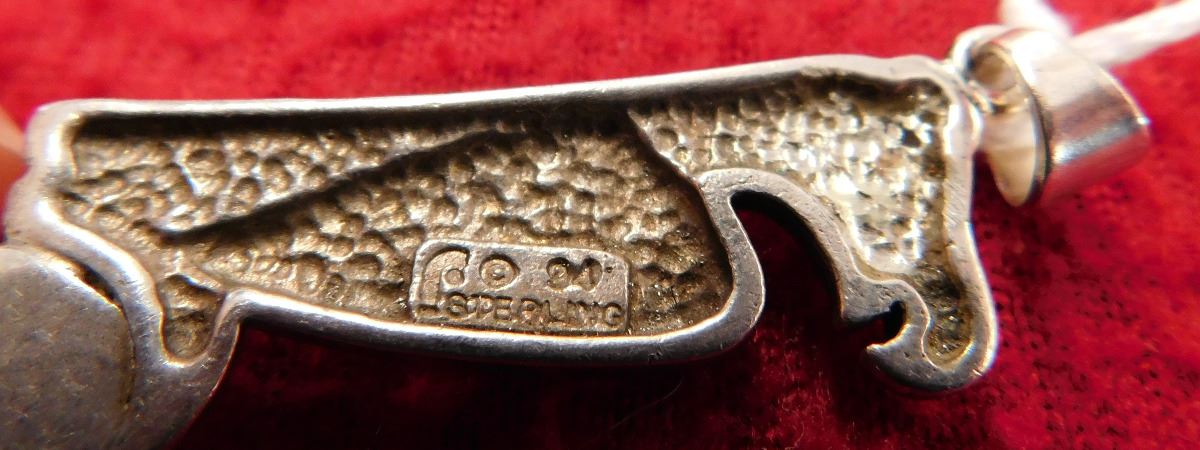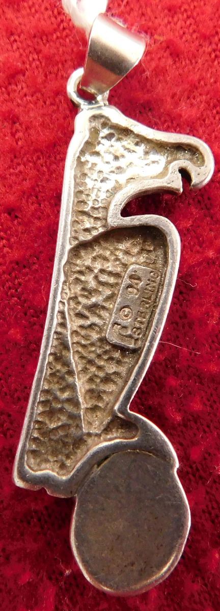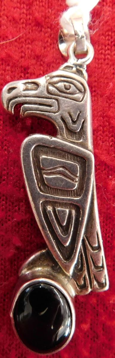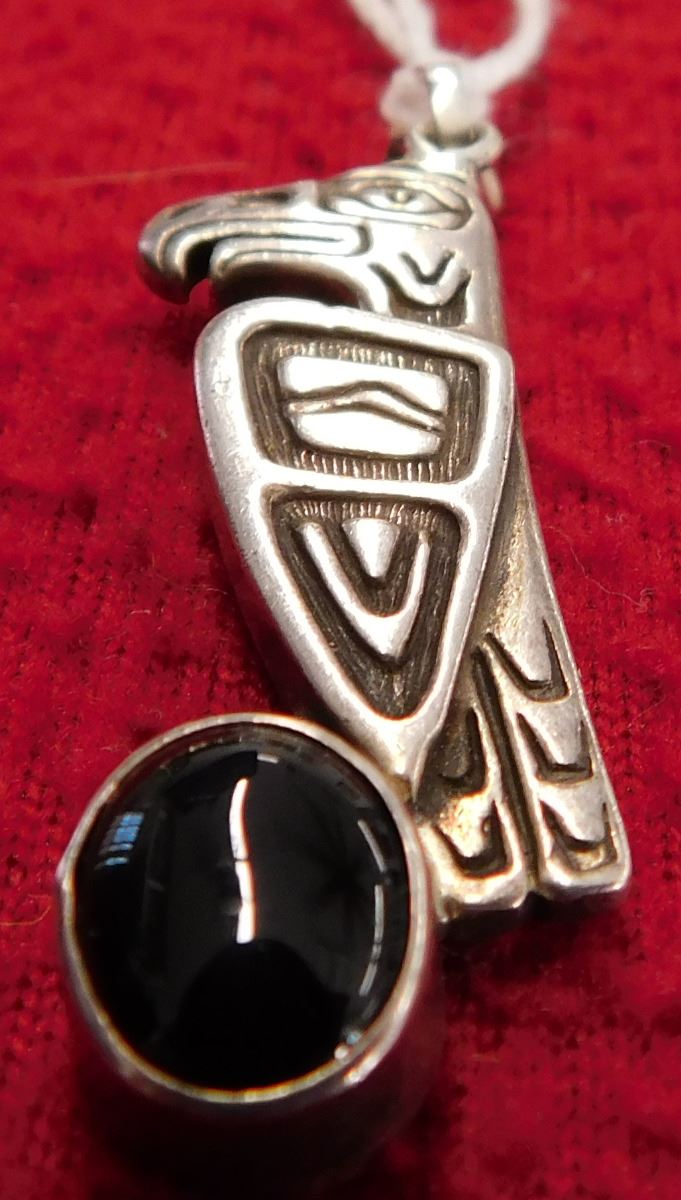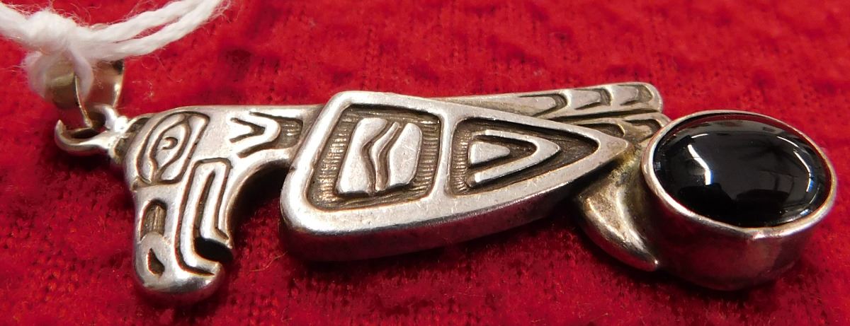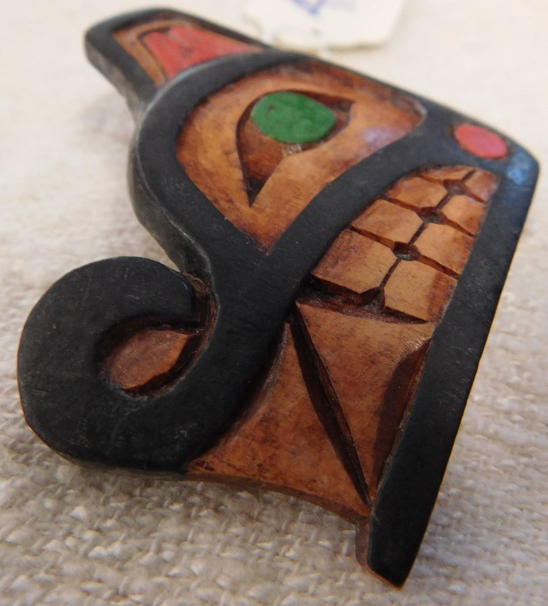 NWC Wolf Pin + NWC-style Sterling Raven Pin, circa 1990s. Made of wood and paint, Artie George's Wolf measures 1 7/8" x 1 3/4". Other pin included is sterling silver and possibly jet, a perched Raven pendant weighing approx. 5 grams. Raven pendant measures 5/8" x 1 1/2" x 1/4". Canada. Condition: Good, pre-owned, see images. Shipping: $14.50 w/insurance and signature.