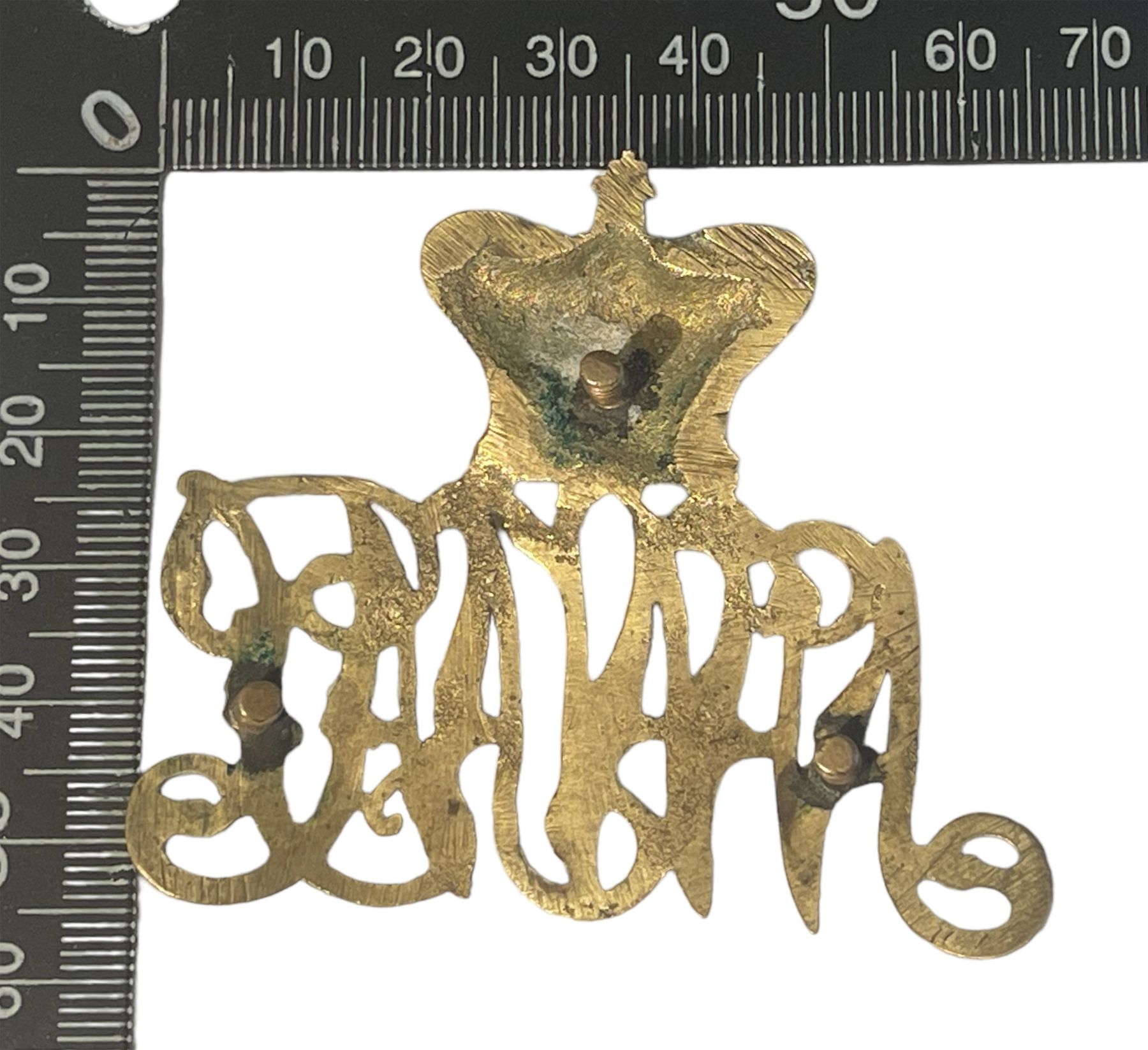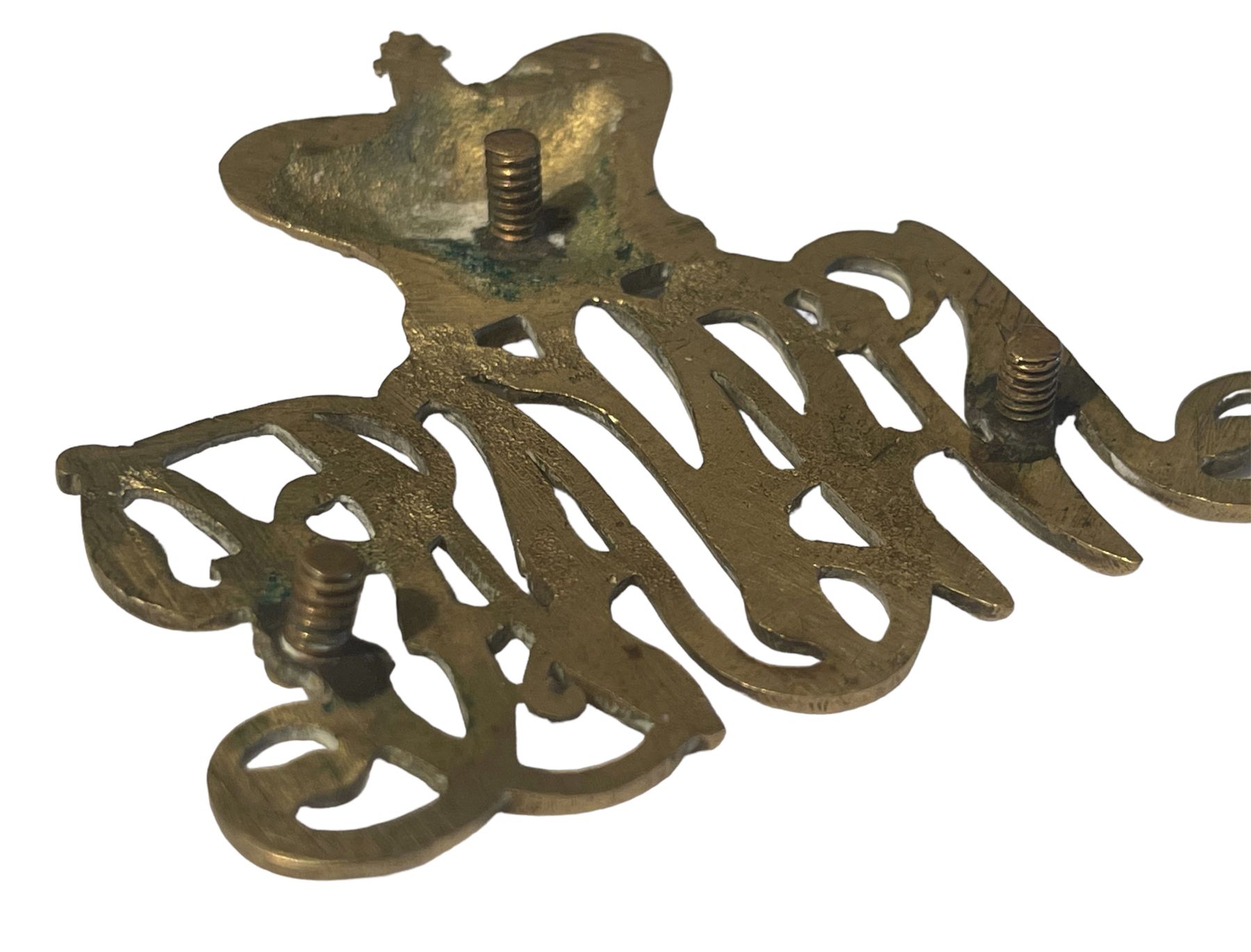 Seldom offered. Victorian Crown over script letters NWMP. Screw Post fasteners. Brass metal.