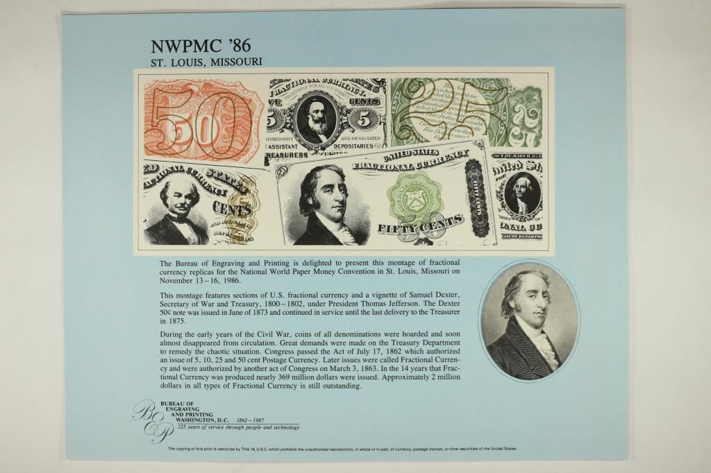 AND PRINTING SOUVENIR CARD WITH A MONTAGE OF FRACTIONAL CURRENCY REPLICAS