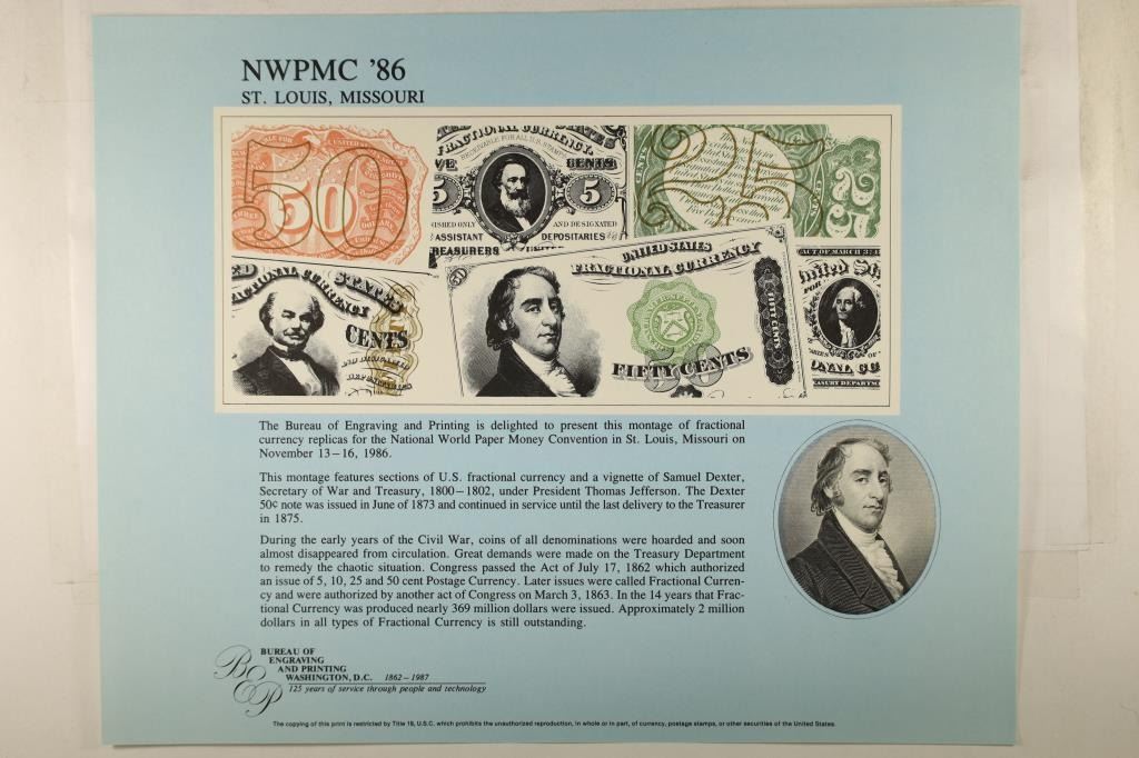FEATURING A MONTAGE OF US FRACTIONAL CURRENCY REPLICAS, PRINTED BY TH BUREAU OF ENGRAVING AND PRINTING