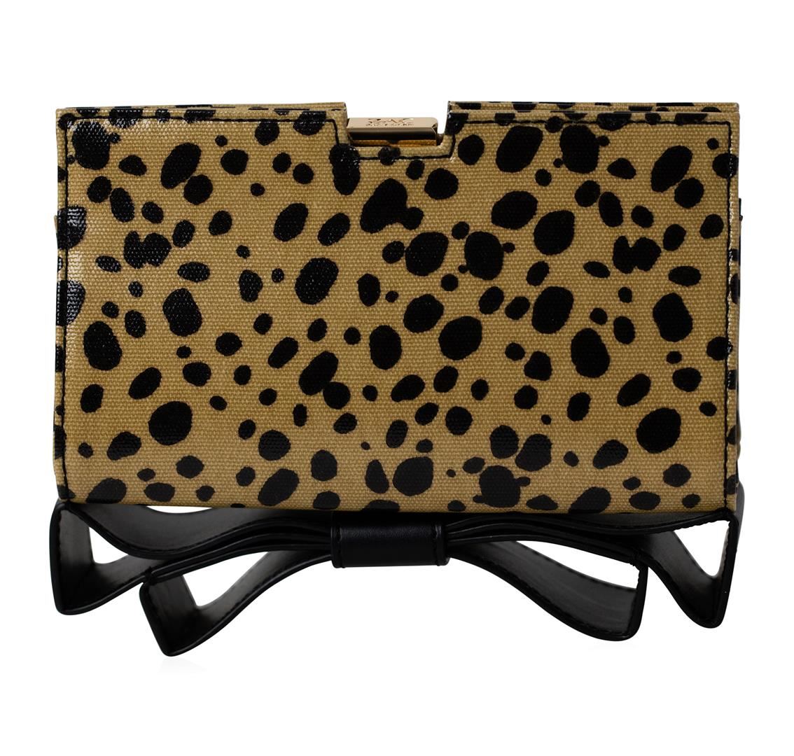 Authentic new with tag Zac Posen Leopard Print Clutch with black bow detail. This pretty little hand-held clutch is the perfect way to add some spice to an evening look. Zac Posen does not disappoint with this fun bag! Complete with gold details and original tag.
