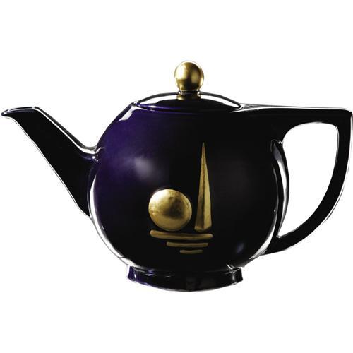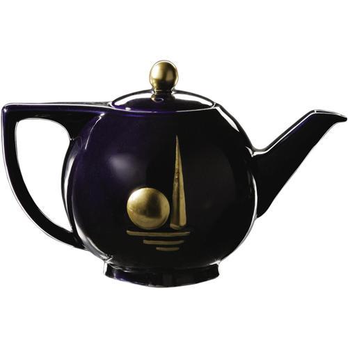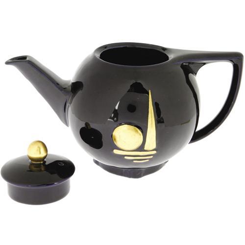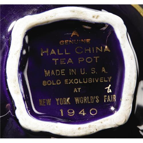 <B>New York 1939-40 World's Fair Hall China Teapot.</B></I> This stunning Art Deco teapot has a dark navy blue glaze overall and is decorated on both sides with a raised golden image of the fair's well-known needle (Trylon) and sphere (Perisphere). A gold transfer on the underside reads, "A GENUINE HALL CHINA TEA POT MADE IN U.S.A. SOLD EXCLUSIVELY AT NEW YORK WORLD'S FAIR 1940". Beautiful, as-made condition. 6.25" high.