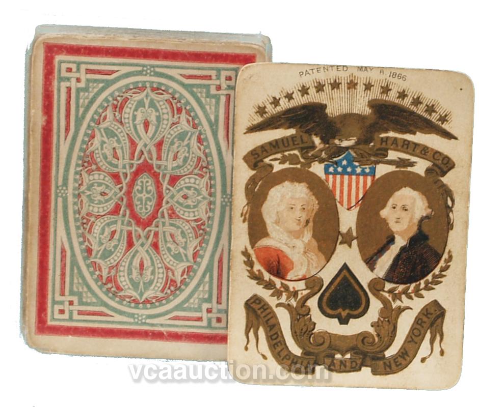 NY Consolidated Card Co. Playing Cards – 52 cards, no joker, beautiful multi-color ace of spades depicting George and Martha Washington. Good condition; c1866 (Hochman NY32).