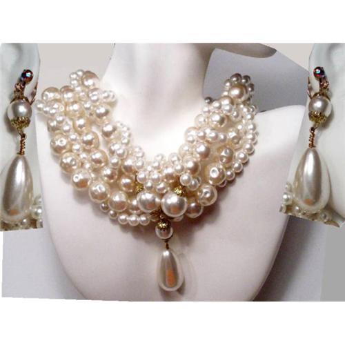 This is surely one of a kind sets that just says ? Get out of my way, I am the DIVA TONIGHT!?. We purchased this years back from a woman who was wore this at a Runway fashion show and as you know when you see jewelry in these shows it is ALWAYS over the top!. This one measures a whopping 3? WIDE and can be worn tight against the neck so the large cluster pearl colored drop (almost 3/4? wide) hangs down, or looser so it hangs more like a collar. The pearl colored beads are dimpled and round and huge and wrapped and intertwined in each other to form this vine like necklace! This is such an amazing piece when worn that you can only expect woman to hate you and men to adore you!. The necklace will go up to 18? long and the long rhinestone topped pearl color earrings are 2 1/2? long and 3/4? wide. As you can see when it is draped across the mannequin?s neck, it would look like a pearl color collar all the way around. These are large beads on the whole set and the soft white color really reflects the light and makes skin look soft and creamy! There is a pearl color extender that drops down the back of your neck for effect. We were told a fashion designer did this just for that show and it was never worn again. Very little wear makes this a set so fabulous! Just imagine owning a piece that looks like it came off a 40?s actress at a red carpet event and NO ONE else ever having one! The earrings are screw on so they can adapt to any ear. I have an extra set of pierced tops I can include ...