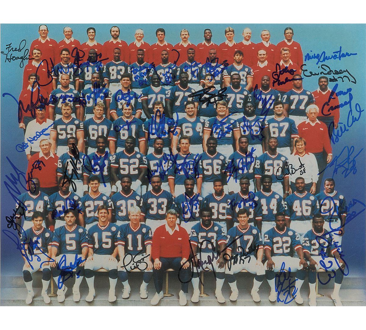 Color glossy 14 x 11 photo of the 1986 New York Giants Super Bowl Championship team, signed in blue and black felt tip by 43 members, including: Super Bowl MVP Phil Simms, Harry Carson, O. J. Anderson, Mark Bavaro, Joe Morris, William Roberts, Mark Collins, Jeff Rutledge, Raul Alegre, Sean Landetta, Carl Banks, Andy Headen, Kenny Hill, Bart Oates, Eric Dorsey, Bill Ard, Byron Hunt, Zeke Mowatt, Phil Mokonkey, Lee Rouson, Carl Nelson, Elvis Patterson, Stacey Robinson, Bobby Johnson, Soloman Miller, and Lionel Manuel. In fine condition.