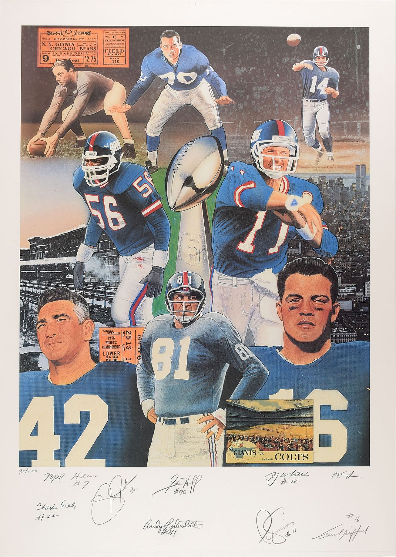 Color limited edition 20 x 28 print honoring the history of the New York Giants, numbered 30/600, signed in the lower border in pencil by Frank Gifford, Mel Hein, Sam Huff, Andy Robustelli, Lawrence Taylor, Y.A. Tittle, Phil Simms, and Charlie Conerly. In fine condition.