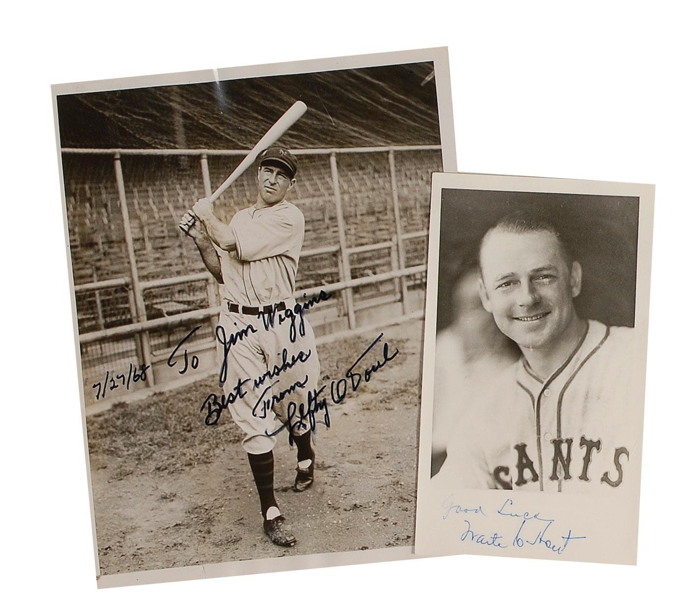 Two photos ranging in size from 4 x 6.75 to 7 x 9, various finishes, each signed in ink or felt tip by the respective player pictured. Signers are: Waite Hoyt and Lefty O’Doul (ins). In overall fine condition with some surface rubbing to the Hoyt photo and mild rippling to the O’Doul image.