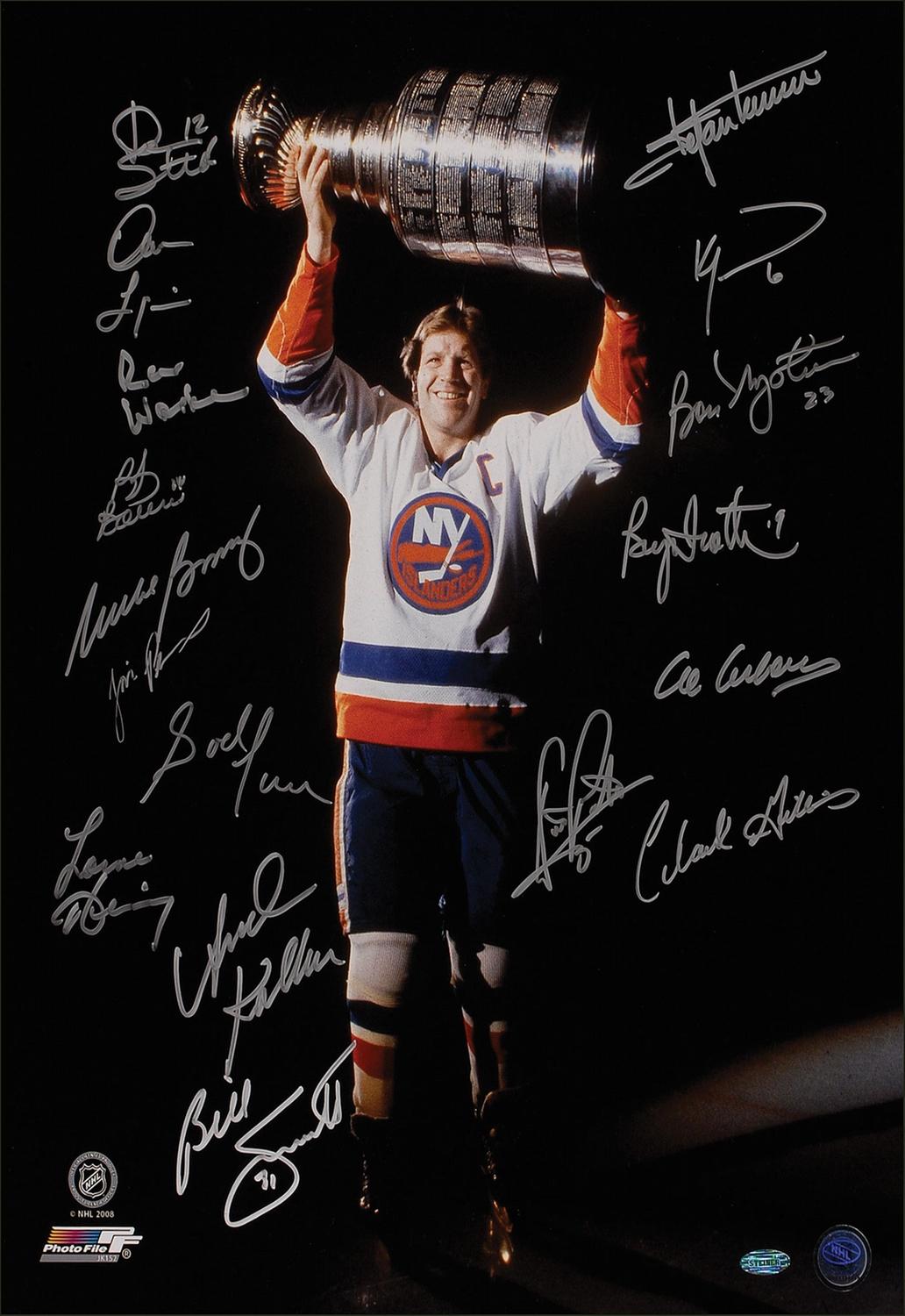 Color glossy 16 x 20 photo of Dennis Potvin holding the Stanley Cup over his head, signed in silver ink by 17 members of the Stanley Cup–winning Islanders including Potvin, Clark Gillies, Jim Pickard, Ken Morrow, Bob Bourne, Mike Bossy, Al Arbour, Ron Waske, Bobby Nystrom, Lorne Henning, Duane Sutter, Anders Kallur, Gord Lane, Bryan Trottier, Dave Langevin, and Billy Smith. In fine condition. Accompanied by a certificate of authenticity from Steiner.