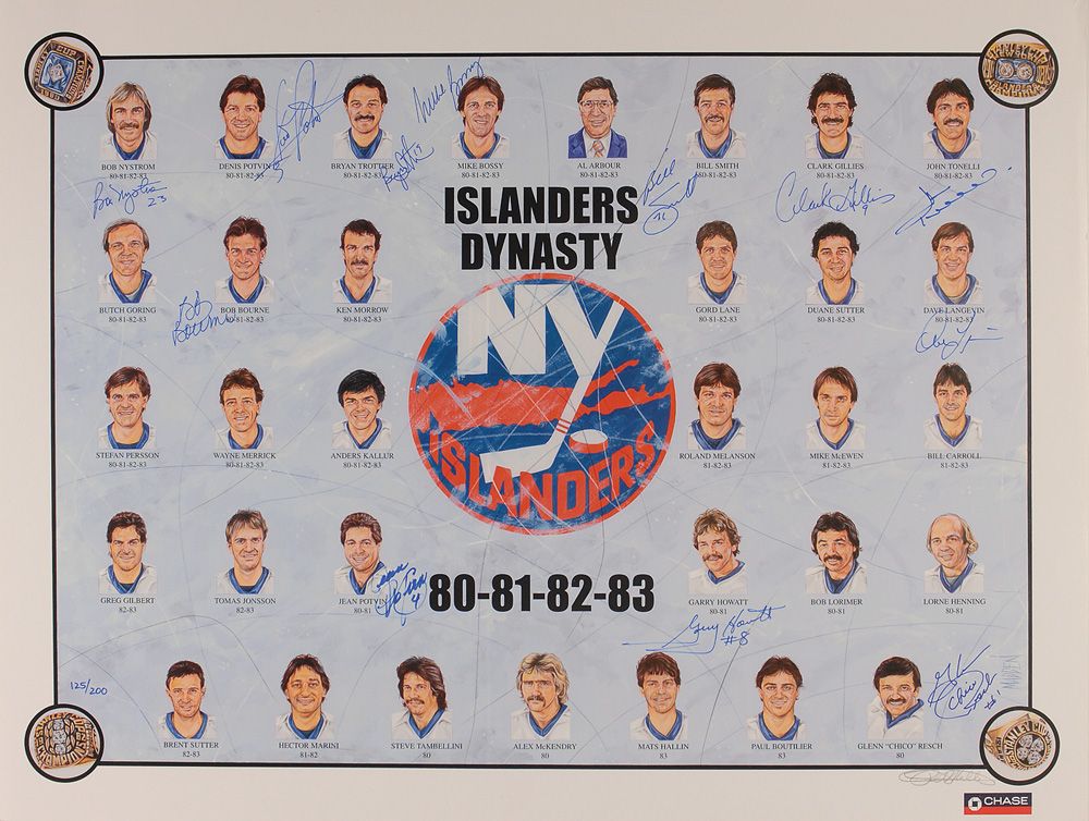 Color limited edition 24 x 18 print entitled Islanders Dynasty, numbered #125/200, signed in blue felt tip by Bob Nystrom, Denis Potvin, Bryan Trottier, Mike Bossy, Bill Smith, Clark Gillies, John Tonelli, Bob Bourne, Dave Langevin, Jean Potvin, Gary Howatt, and Glenn ‘Chico’ Resch. Also signed in the lower right in pencil by the artist. In fine condition.