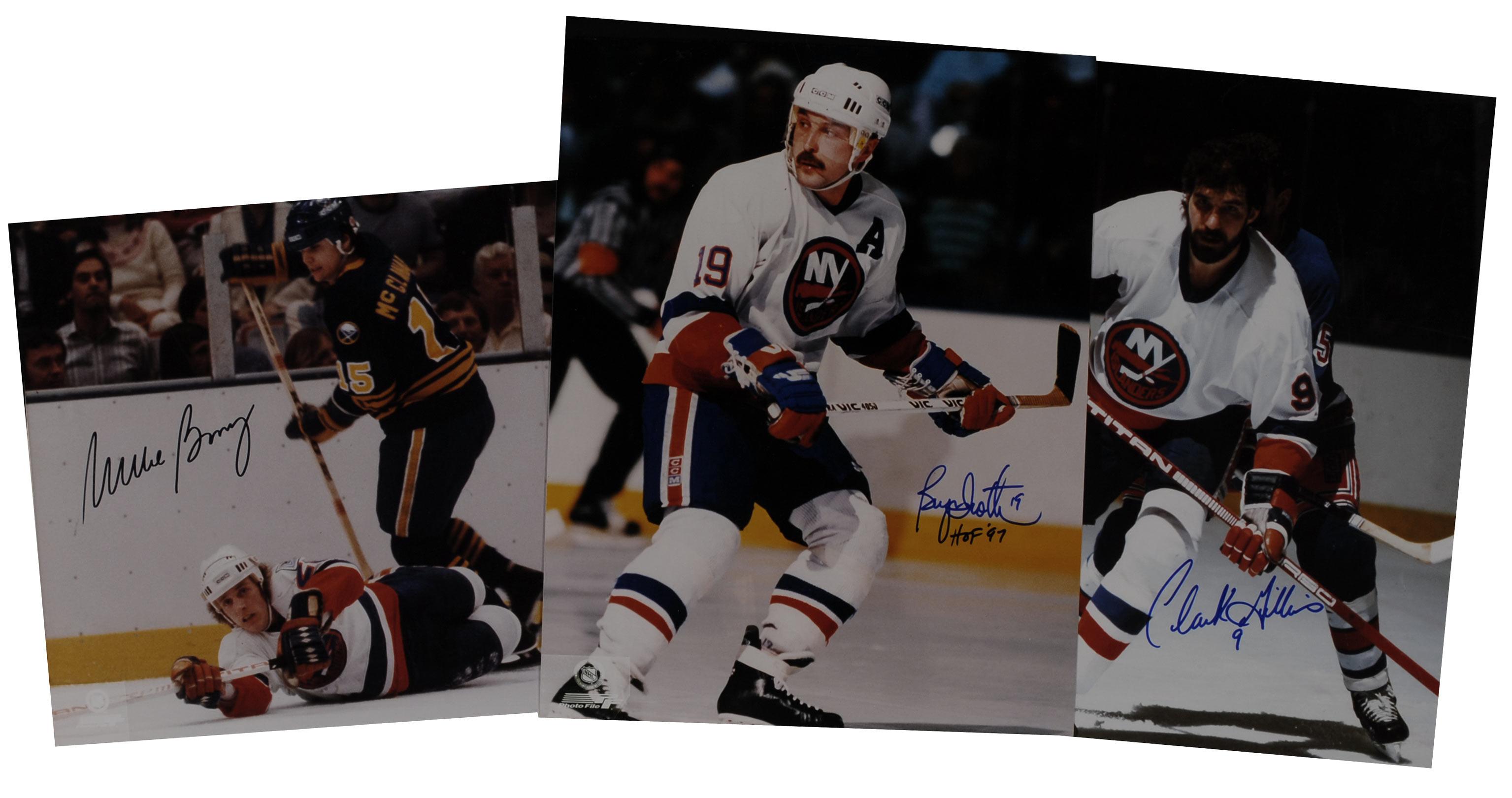Three color glossy photos, two 11 x 14 and one 14 x 11, each signed in blue or black felt tip by the respective Islander pictured. Signers are: Clark Gillies, Bryan Trottier, and Mike Bossey. In fine condition.